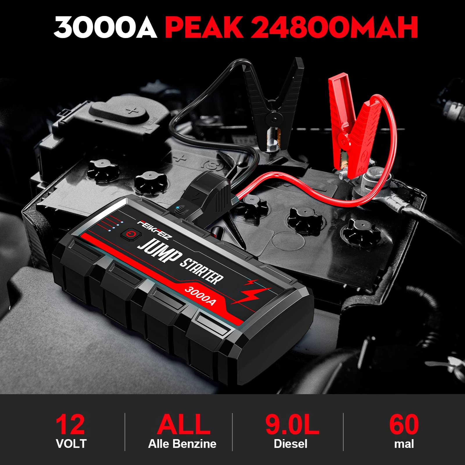 FEIKFEIZ Starthilfe Powerbank 3000A 24800mAh 12V (Wszystkie silniki benzynowe i do 9,0L silników diesla) Auto Starthilfe, Booster do akumulatora samochodowego z latarką LED i wyjściem USB3.0..