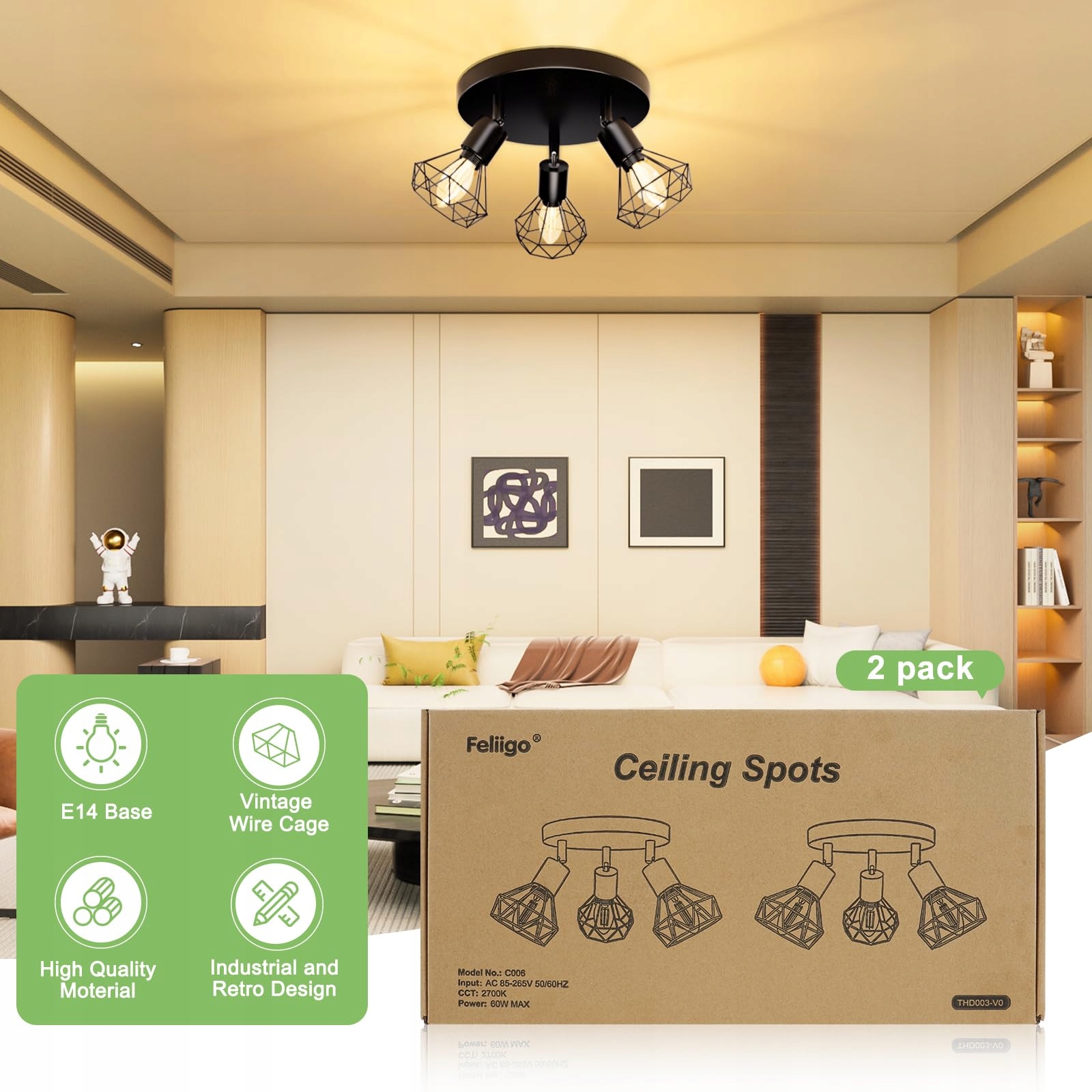 Lampa sufitowa LED Lampa sufitowa Reflektor sufitowy [2sztuki] Obracana 350° Punkty sufitowe E14 3-płomieniowa Czarna Lampa do kuchni Lampa do salonu, Lampa korytarzowa Lampa wisząca Sufitowa Nowoczesna do korytarza, kuchni, sypialni