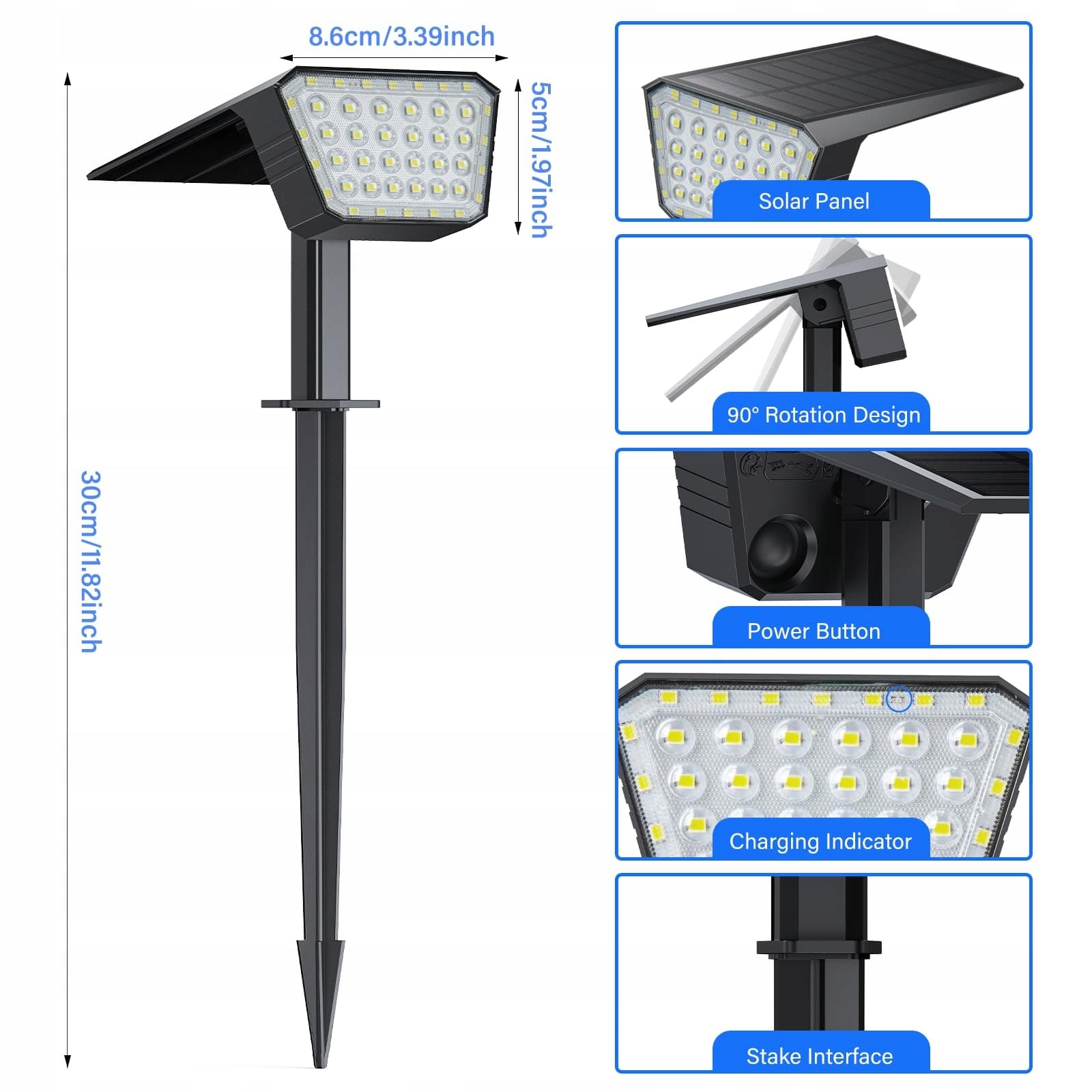 ☀ [2 metody instalacji] – Lampa solarna ogrodowa jest łatwa do montażu, proszę przeczytać wcześniej dołączoną instrukcję obsługi. Po zainstalowaniu akcesoriów do montażu w ziemi, lampy solarne można pionowo wbić w miękką ziemię. Można również usunąć gwoździe ziemne i przymocować lampy solarne do ściany za pomocą śrub. Kąt nachylenia głowicy lampy można regulować w zakresie 90° w górę i w dół.