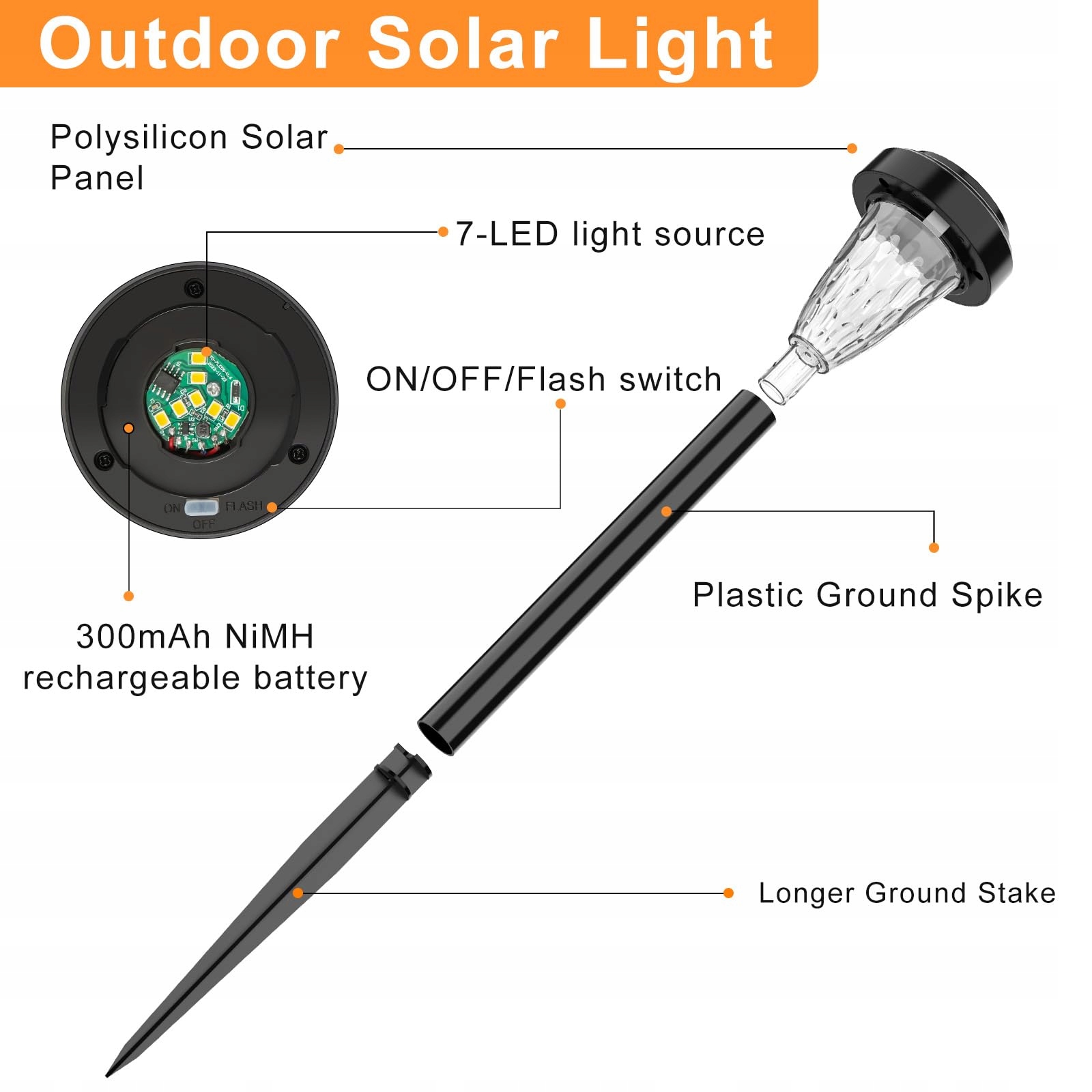[ FIFIying lampa solarna na zewnątrz ] – Wykonana z polikrystalicznego panelu słonecznego, akrylowego klosza i kołków ziemnych z ABS. Panel solarny przekształca energię słoneczną w energię elektryczną i magazynuje ją w akumulatorze niklowo-metalowo-wodorkowym o pojemności 300 mAh. Wbudowane wysokiej jakości 7 diod LED emitują jasne i miękkie światło.