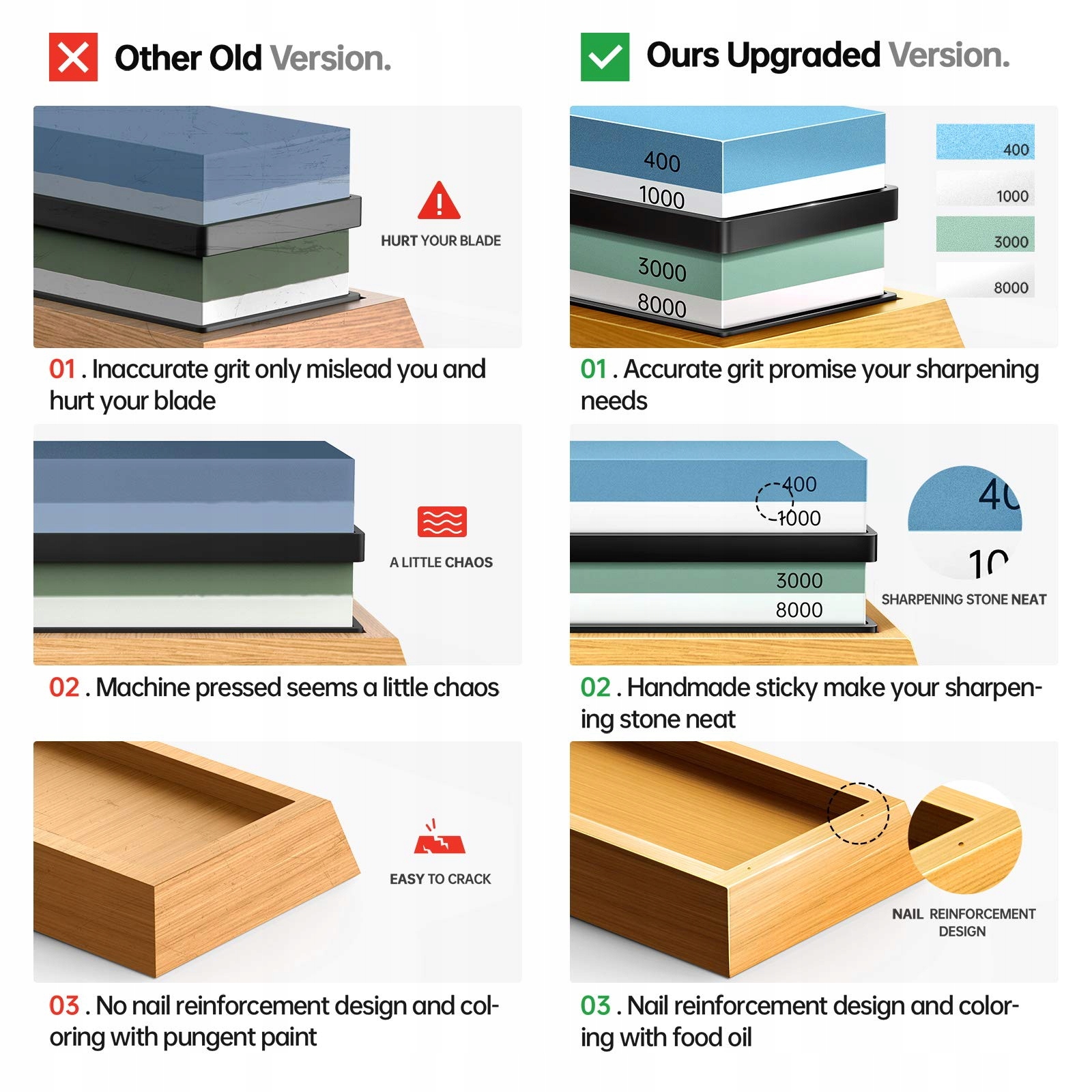 KAMIEŃ SZLIFIERSKI 400/1000 3000/8000 JEST ODPOWIEDNI DO WIĘKSZOŚCI OPERACJI SZLIFIERSKICH - 4 rodzaje gradacji są bardzo precyzyjne, nadaje się do drogich lub tanich noży kuchennych ze stali nierdzewnej, w tym nożyczek, ostrzy X-Acto, scyzoryków, noży myśliwskich, dłut, siekier, brzytew, mieczy lub nawet maczet. Zestaw kamieni szlifierskich może ostrzyć je jak nowe.