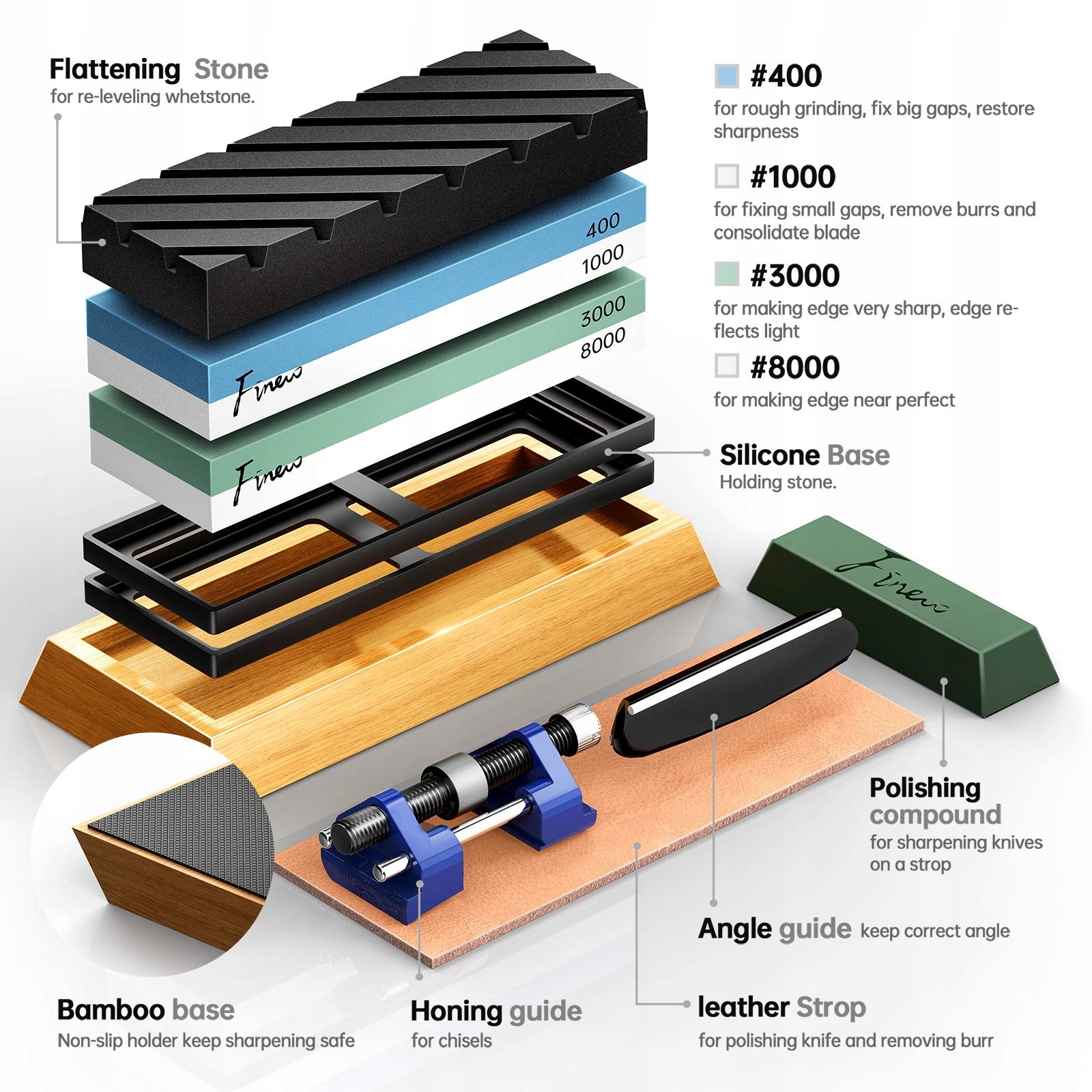 Zestaw kamieni szlifierskich, Finew Premium kamień szlifierski dwustronny 400/1000 3000/8000, kamień do ostrzenia noży, z antypoślizgową bambusową podstawą, kamień płaski, prowadnica kątowa, pasek skórzany, masa polerska, prowadnica do ostrzenia