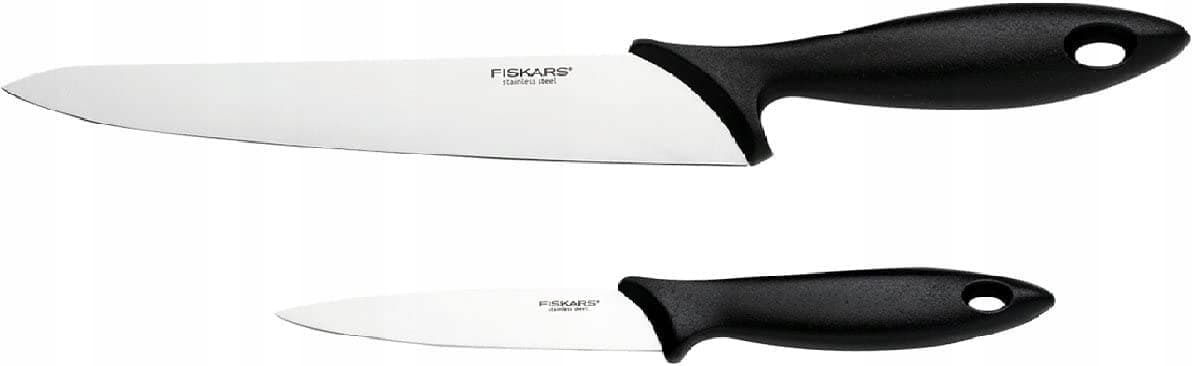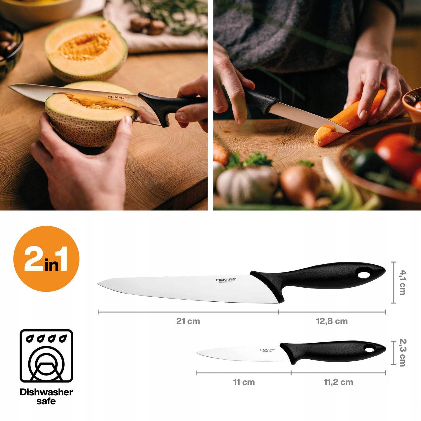 Zakres dostawy: 1x zestaw noży Fiskars, 2-częściowy, Essential, nóż kuchenny i nóż do warzyw (długości ostrzy: 21 cm i 11 cm), stal nierdzewna/plastik PP, czarny, 1065582