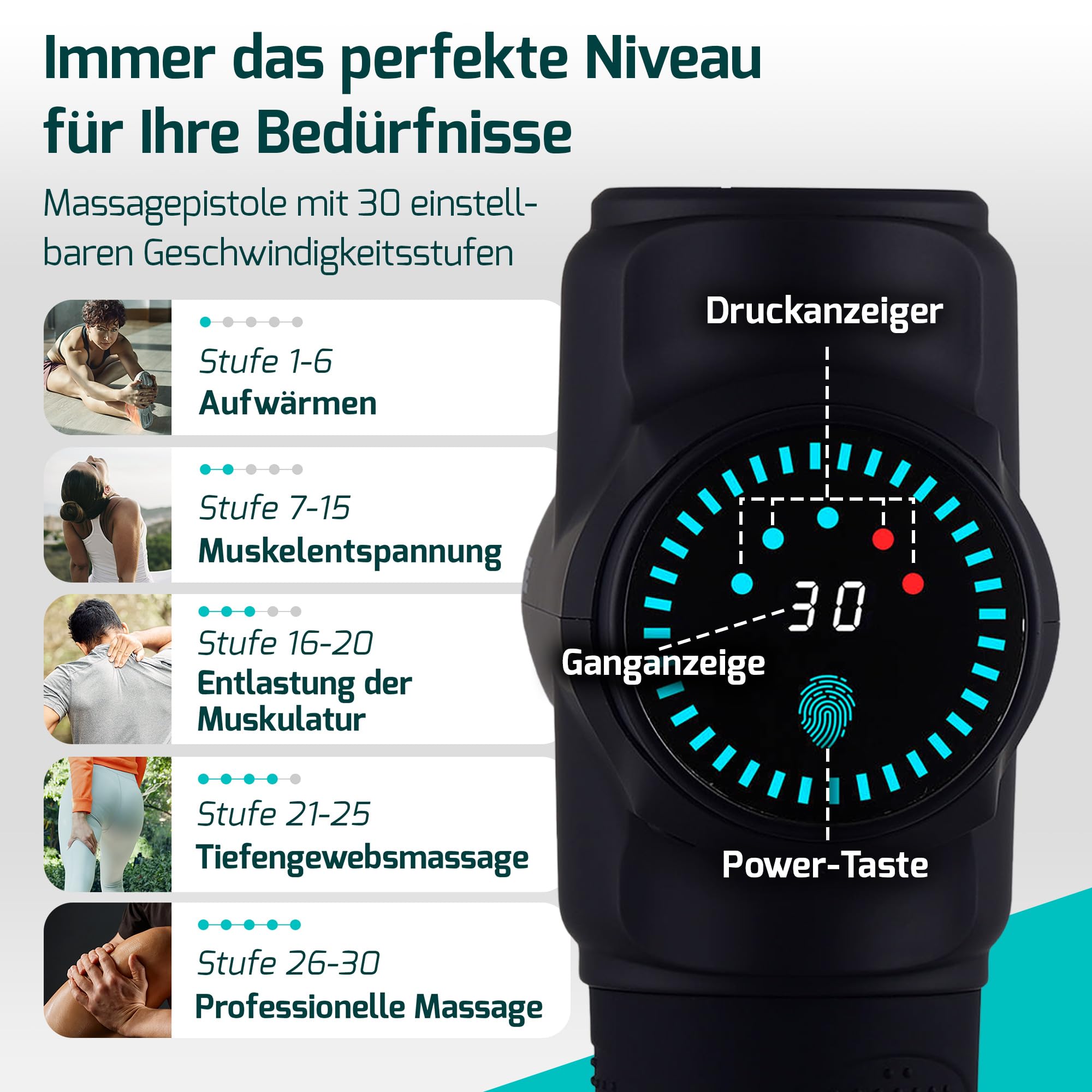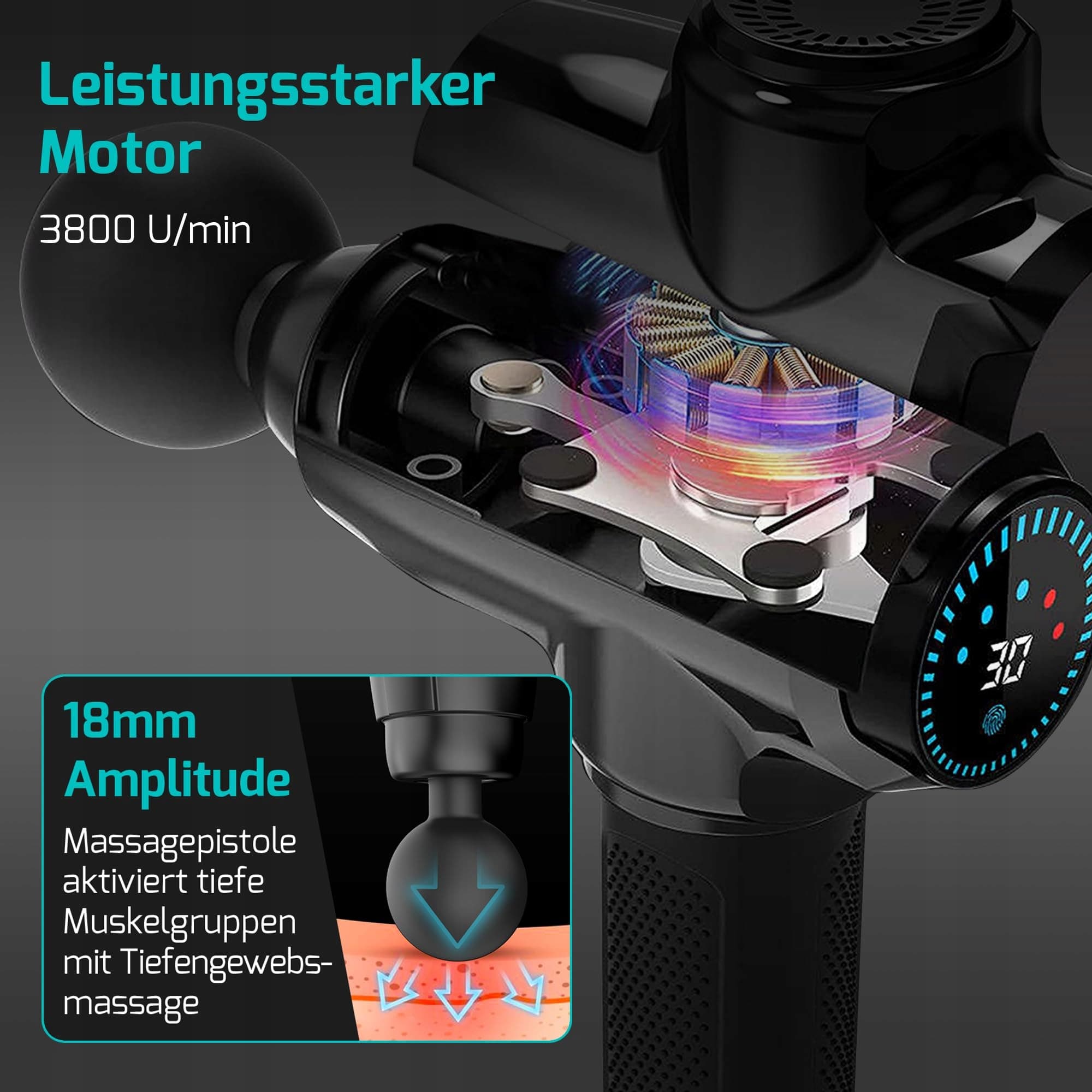 FITAGE Pistolet do masażu, ciche urządzenie do masażu z 30 regulowanymi poziomami prędkości, Pistolet do masażu, 8 końcówek do masażu głębokiego, ramion, pleców i relaksacji całego ciała, Pistolet do masażu – Oryginał