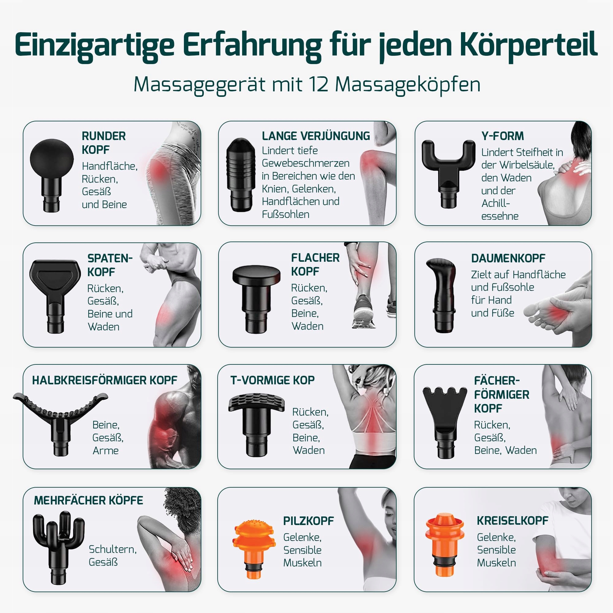 REGULOWANY MASAŻ – To urządzenie do masażu jest wyposażone w 12 precyzyjnych głowic do masażu, dostosowanych do różnych grup mięśniowych i potrzeb regeneracyjnych. Zmień głowicę do masażu w mgnieniu oka, aby dostosować masaż do swoich potrzeb, wspierając zdrowie mięśni i łagodząc ból.