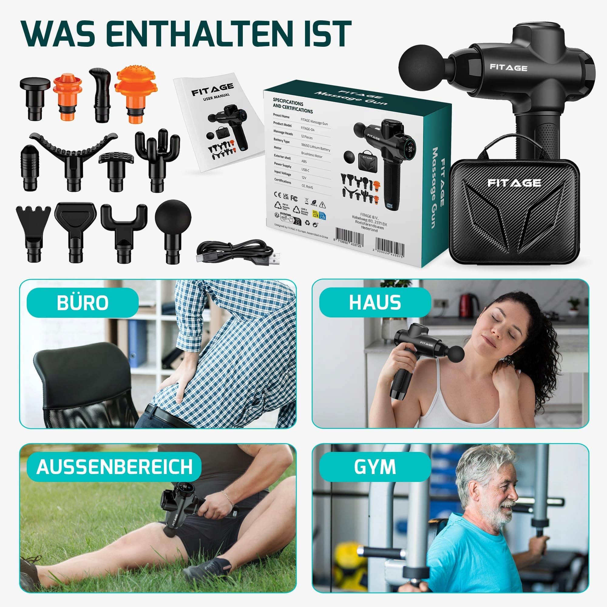 FITAGE Pistolet Do Masażu Cichy 30 Prędkości 8 Końcówek Do Ciała