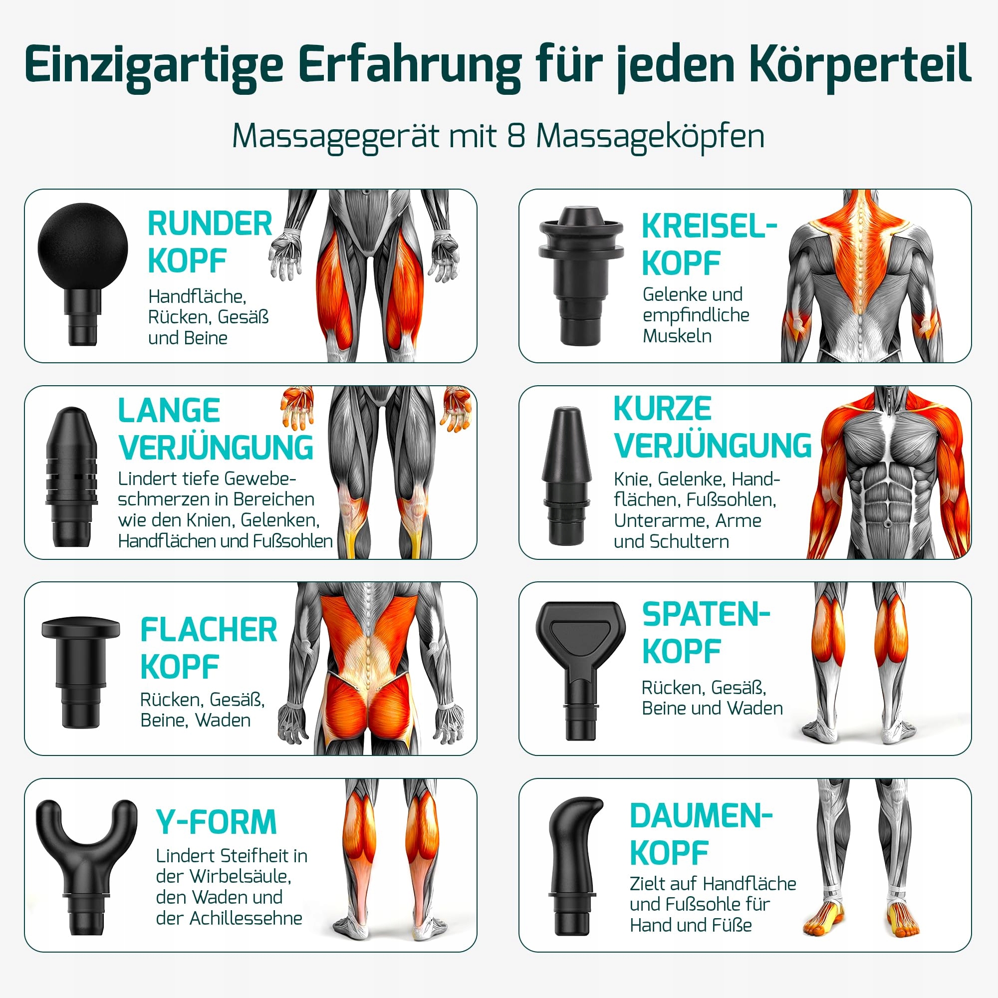 REGULOWANY MASAŻ – To urządzenie do masażu jest wyposażone w 8 precyzyjnych głowic do masażu, które odpowiadają różnym grupom mięśniowym i potrzebom regeneracyjnym. Zmień głowicę do masażu w mgnieniu oka, aby dostosować masaż do swoich potrzeb, wspierając zdrowie mięśni i łagodząc ból.