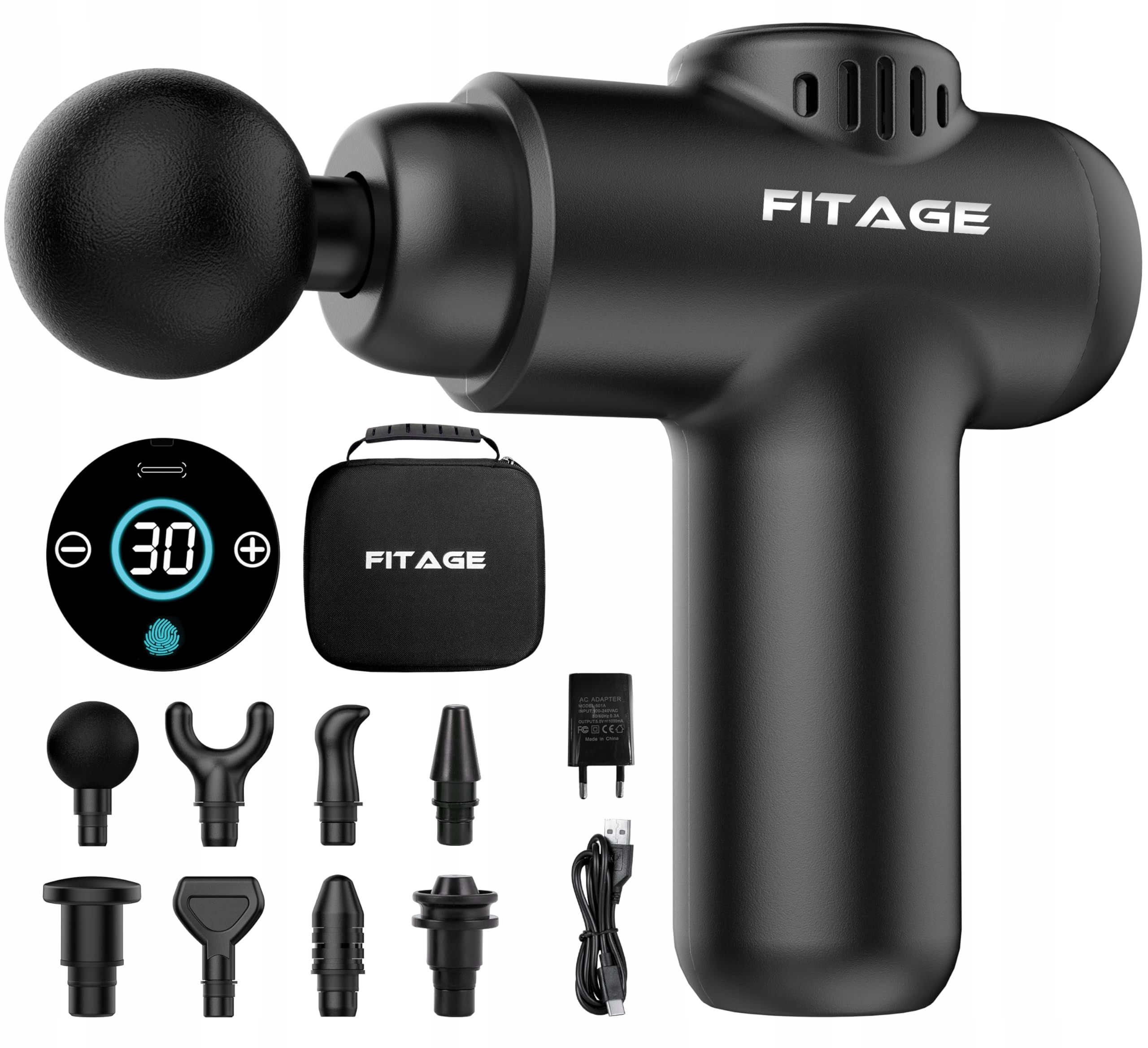 FITAGE Pistolet Do Masażu Cichy Z 30 Prędkościami 8 Końcówek Do Ciała