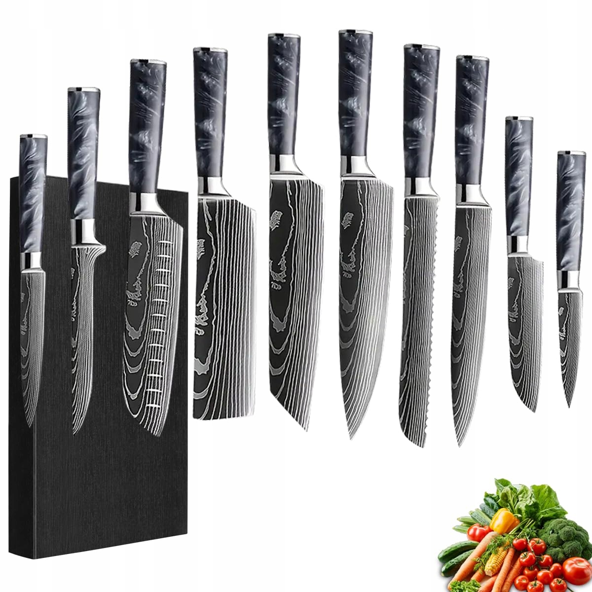 ZESTAW NOŻY FIVE COWS, z 10-elementowym, uchwytem z żywicy, zestaw noży kuchennych z nożem szefa kuchni, nożem do chleba, nożem santoku, nożem do obierania, wzorem damasceńskim, profesjonalny zestaw noży kuchennych w pudełku prezentowym (Czarny)