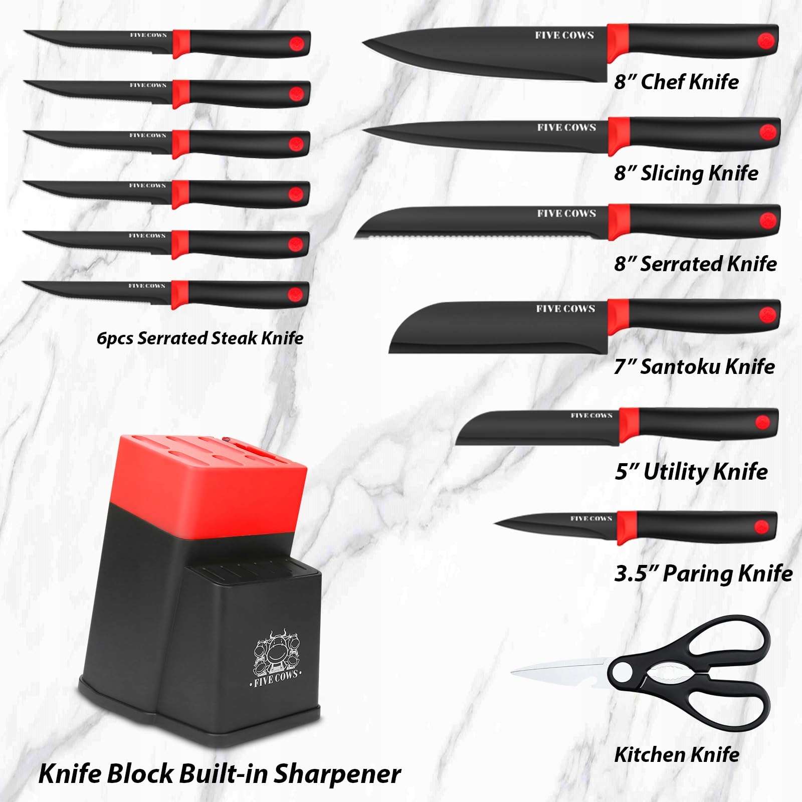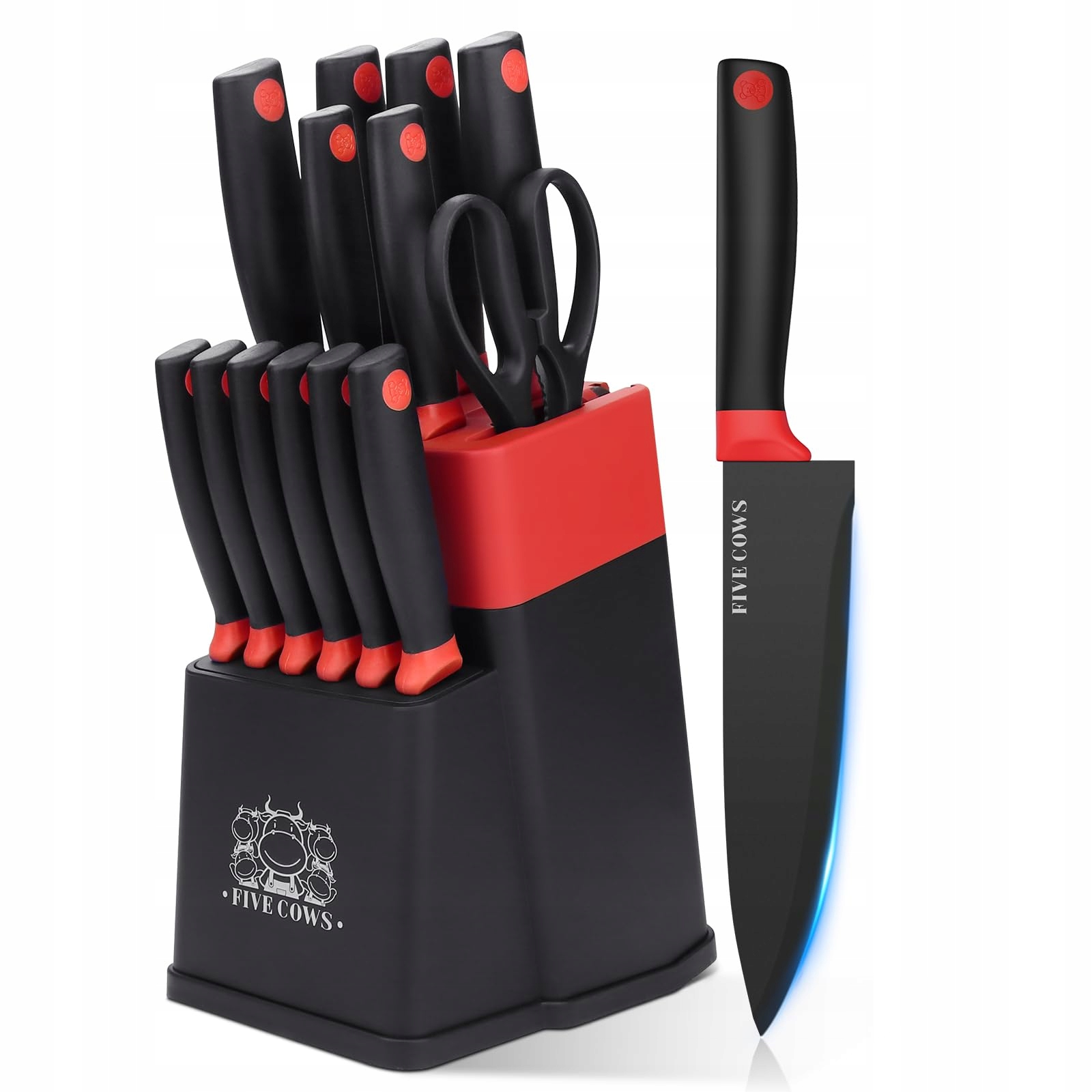 Zestaw bloków noży FIVE COWS, z 14-częściowym zestawem noży kuchennych, z samostrzącym blokiem noży, z nożami do steków i nożyczkami, czarna powłoka zapobiega oksydacji, profesjonalny zestaw do domu