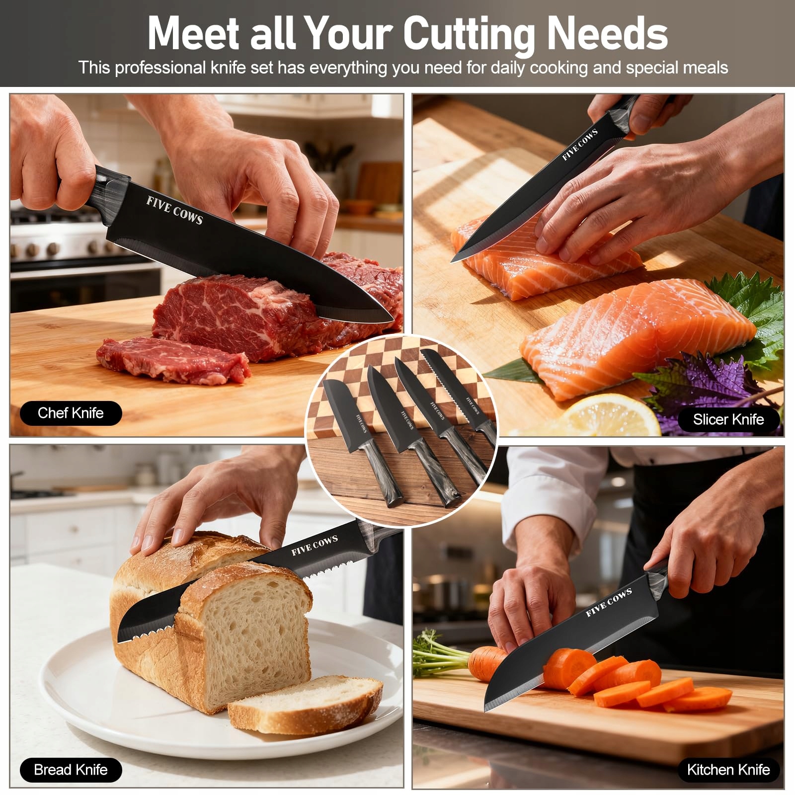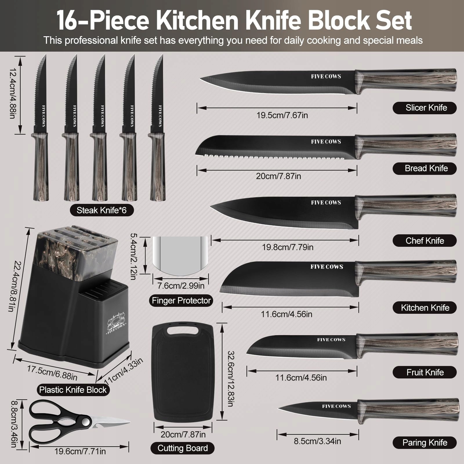 FIVE COWS blok na noże z nożami, z 16-częściowym zestawem noży, z deską do krojenia, ochroną palców, wbudowanym ostrzałką i nożyczkami kuchennymi, profesjonalny zestaw noży kuchennych do użytku domowego (czarny)