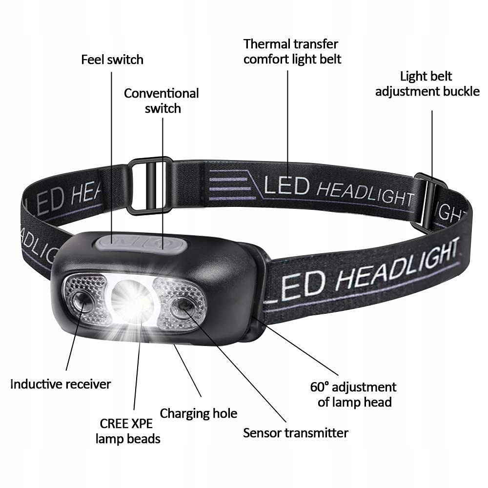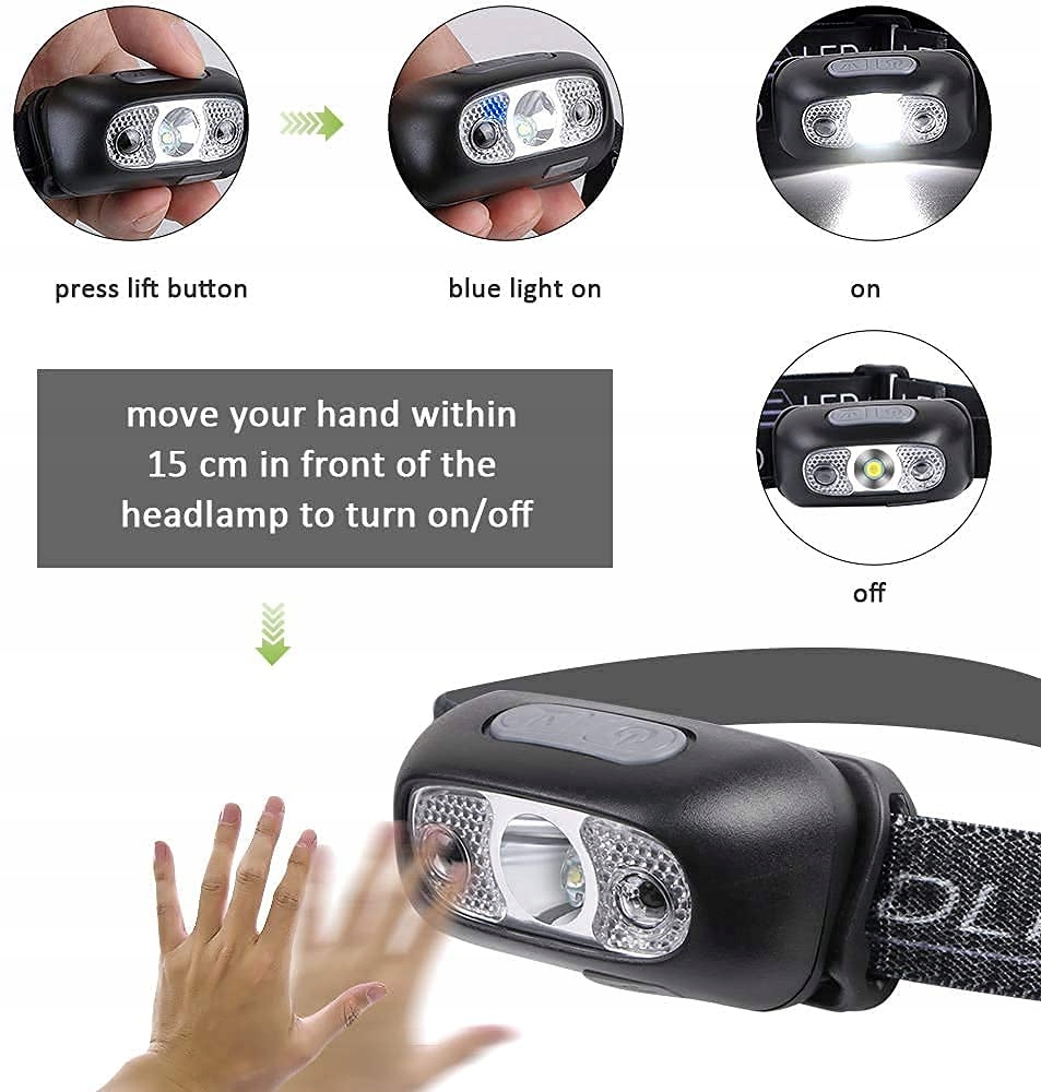 👋【STEROWANIE CZUJNIKIEM】 Wystarczy przesunąć rękę przed latarką czołową, aby ją włączyć lub wyłączyć (w trybie czujnika latarka włącza się automatycznie, gdy wykryje obiekt). Możesz to sprawdzić, machając ręką lub przesuwając inne obiekty. Gdy odległość między Tobą a latarką wynosi 5-10 cm, funkcja wykrywania jest bardziej czuła.