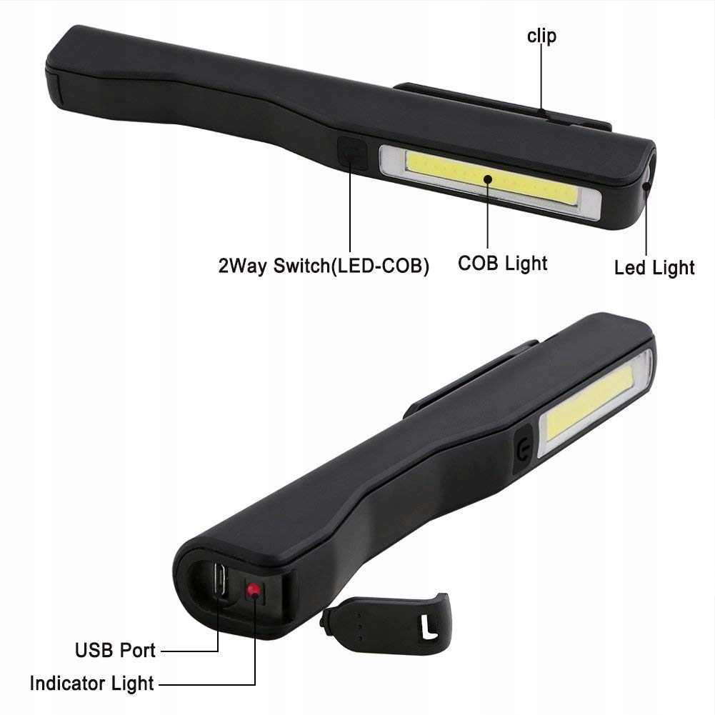 【ŁATWA W UŻYCIU】: Wielokrotnie ładowalna lampa robocza Oba światła są sterowane cyklicznie za pomocą jednego małego gumowego przycisku. Lampa ma własny wewnętrzny akumulator, który można ładować przez gniazdo Micro USB na spodzie. (Dołączamy kabel Micro-USB)