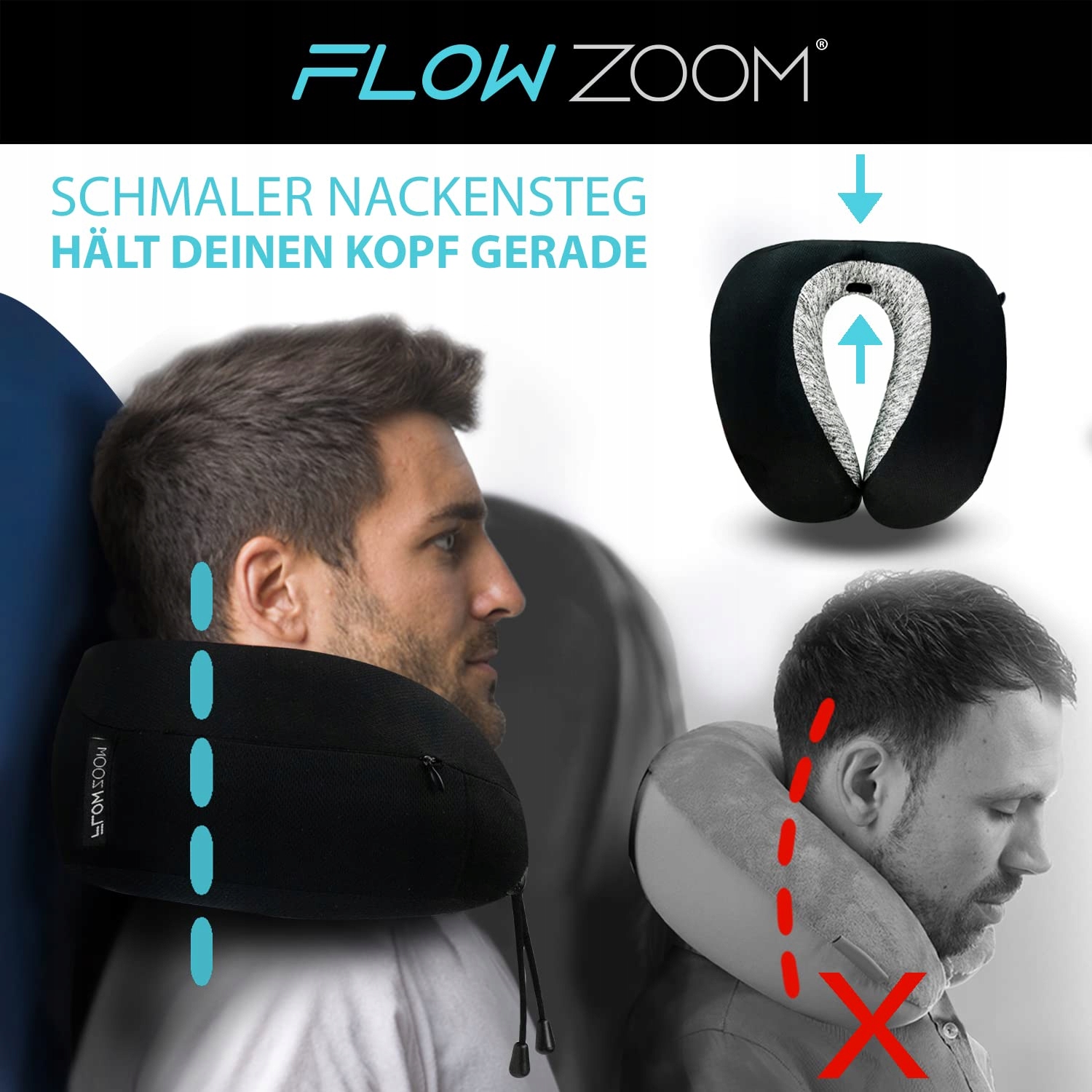 FLOWZOOM® Dream Nackenkissen Reise-Kissen dla samolotu i samochodu z miękkiej pianki memoryfoam z wąskim tyłem i zdejmowanym pokrowcem (miękki i oddychający) - Nackenhörnchen dla dorosłych w kolorze czarnym