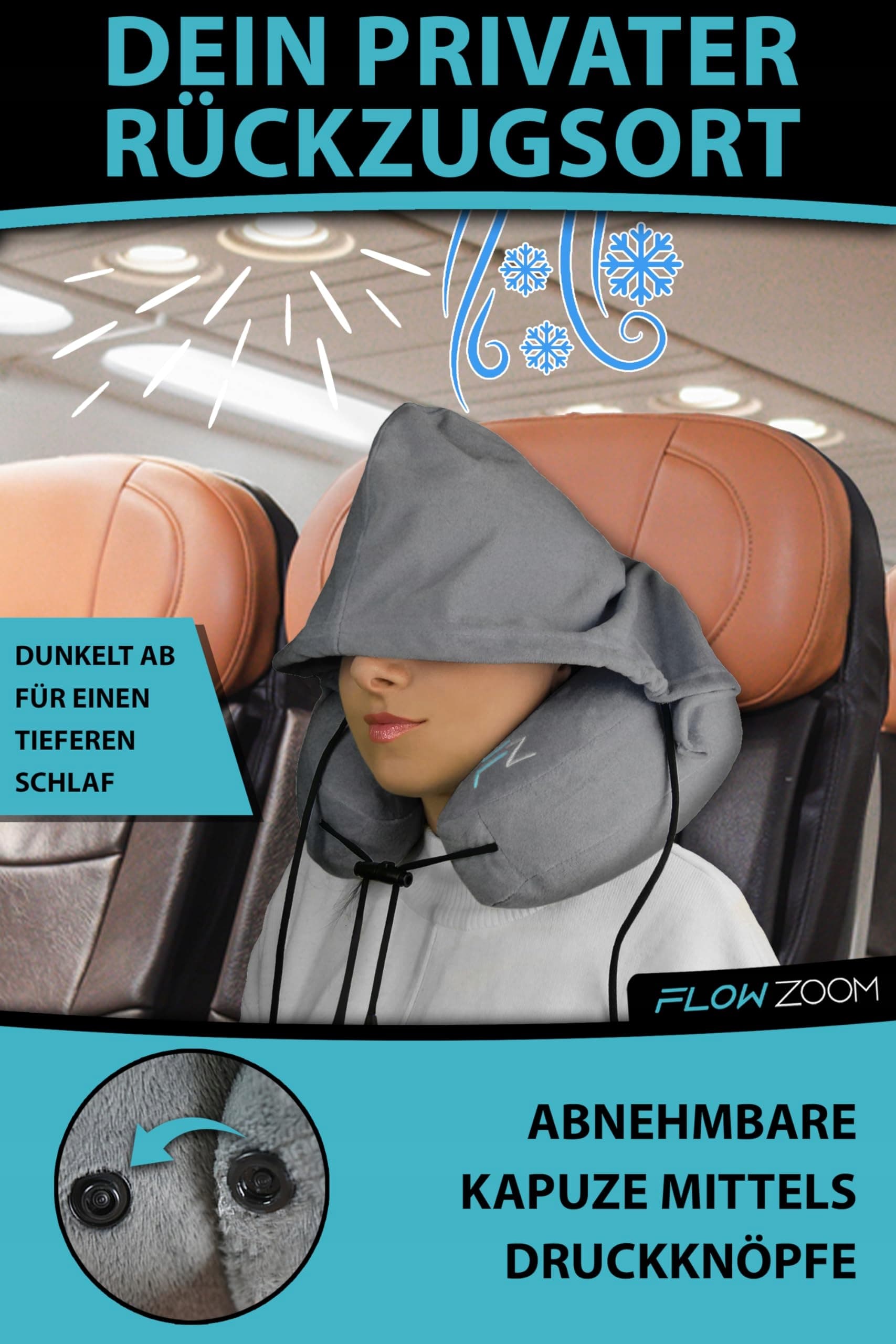 FLOWZOOM Poduszka na szyję dmuchana w mniejszym rozmiarze damskim | Poduszka na szyję do samolotu dmuchana | Poduszka na szyję w podróży | Neck Pillow Travel | Poduszka na szyję do samolotu z kapturem (szara, rozmiar M)