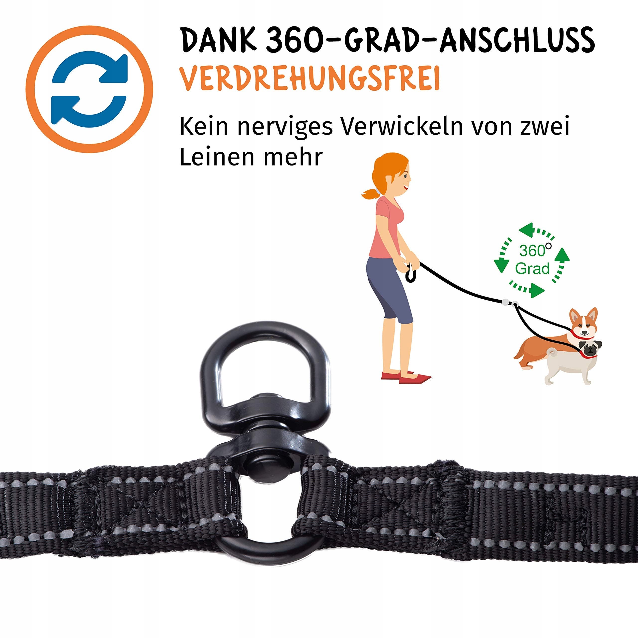Floxik Doppelleine klein | Elastyczna, odblaskowa, premium smycz dla dwóch psów z krótkim uchwytem, czarna