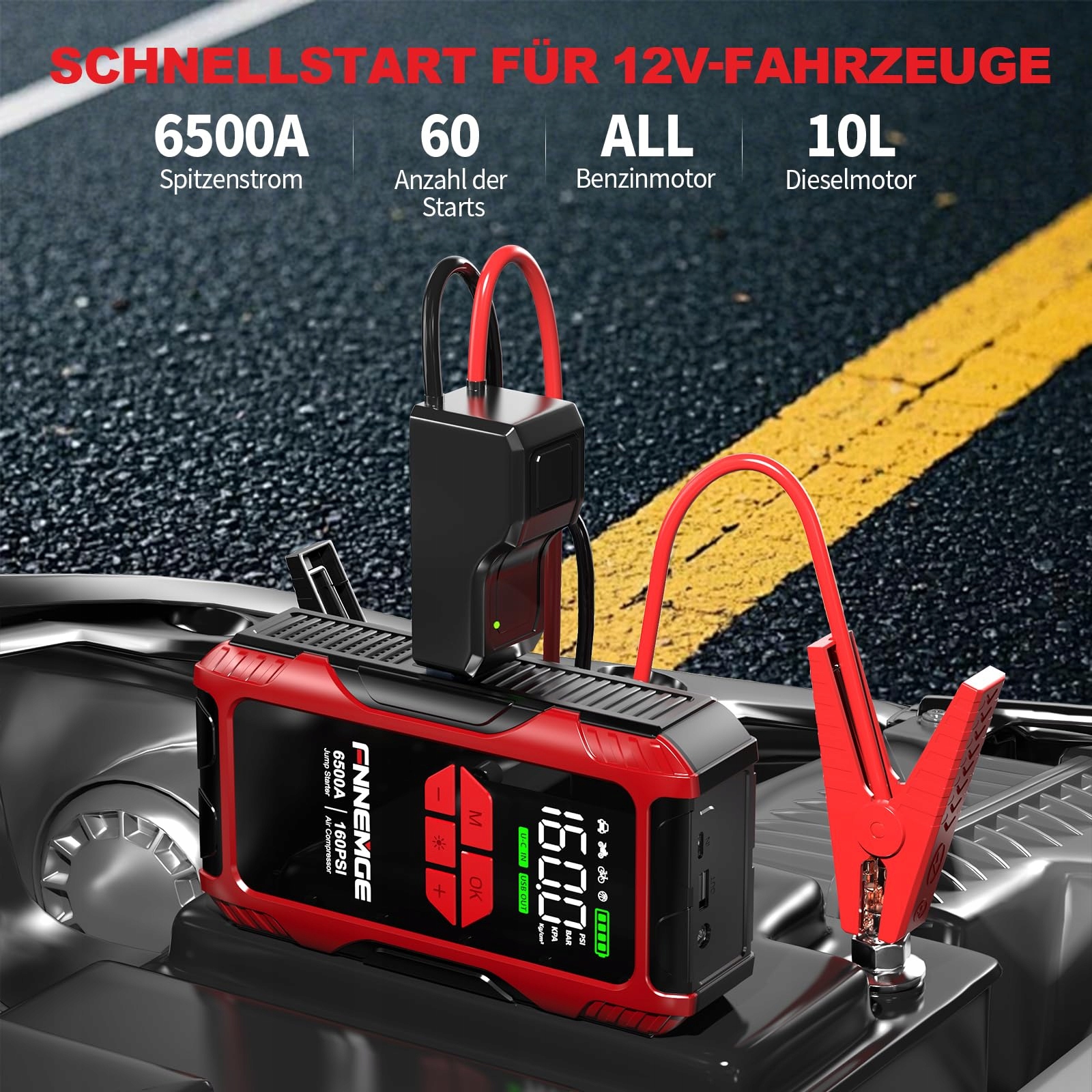FNNEMGE Powerbank do rozruchu 26800mAh 6500A maksymalna moc, z kompresorem 160PSI, 12V (wszystkie benzynowe i 10,0L Diesel) Booster do samochodów, z ekranem LCD, z 2 oświetleniami LED.