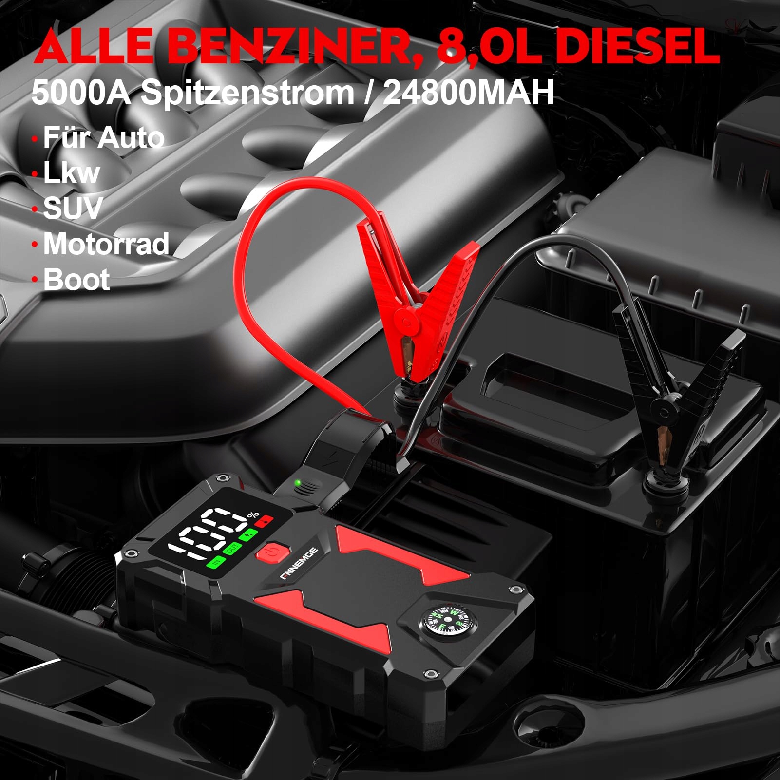 FNNEMGE Powerbank rozruchowa 5000A 12V (Wszystkie benzynowe i do 8,0L diesla) ulepszony booster akumulatora samochodowego, z bezprzewodowym ładowaniem 10W powerbankiem i inteligentnym kablem rozruchowym.