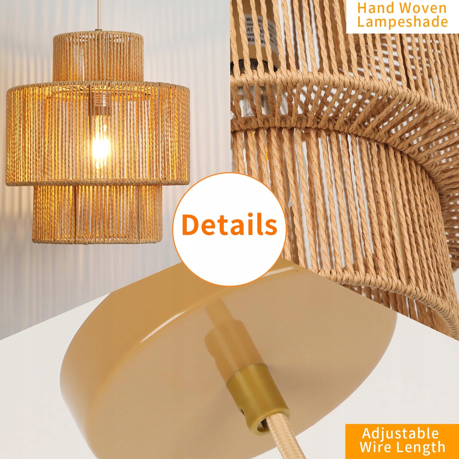 【Wysokiej jakości materiał】Klosz naszej lampy wiszącej Rattan wykonany jest z naturalnego i wysokiej jakości papierowego sznura, połączonego z ręcznie tkanym, który jest bezpieczny, ekologiczny i zdrowy. Ponadto solidny materiał metalowy również wydłuża żywotność, zapewniając lekki i stabilny klosz lampy.