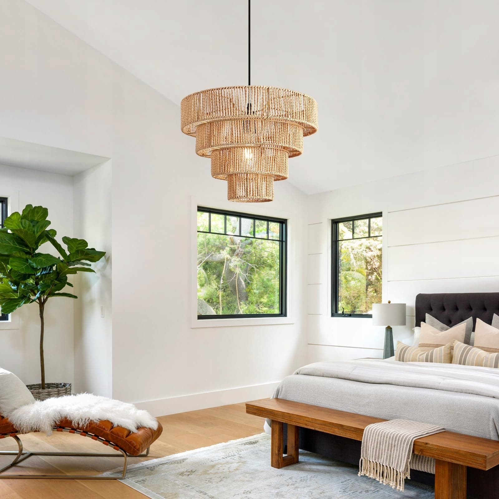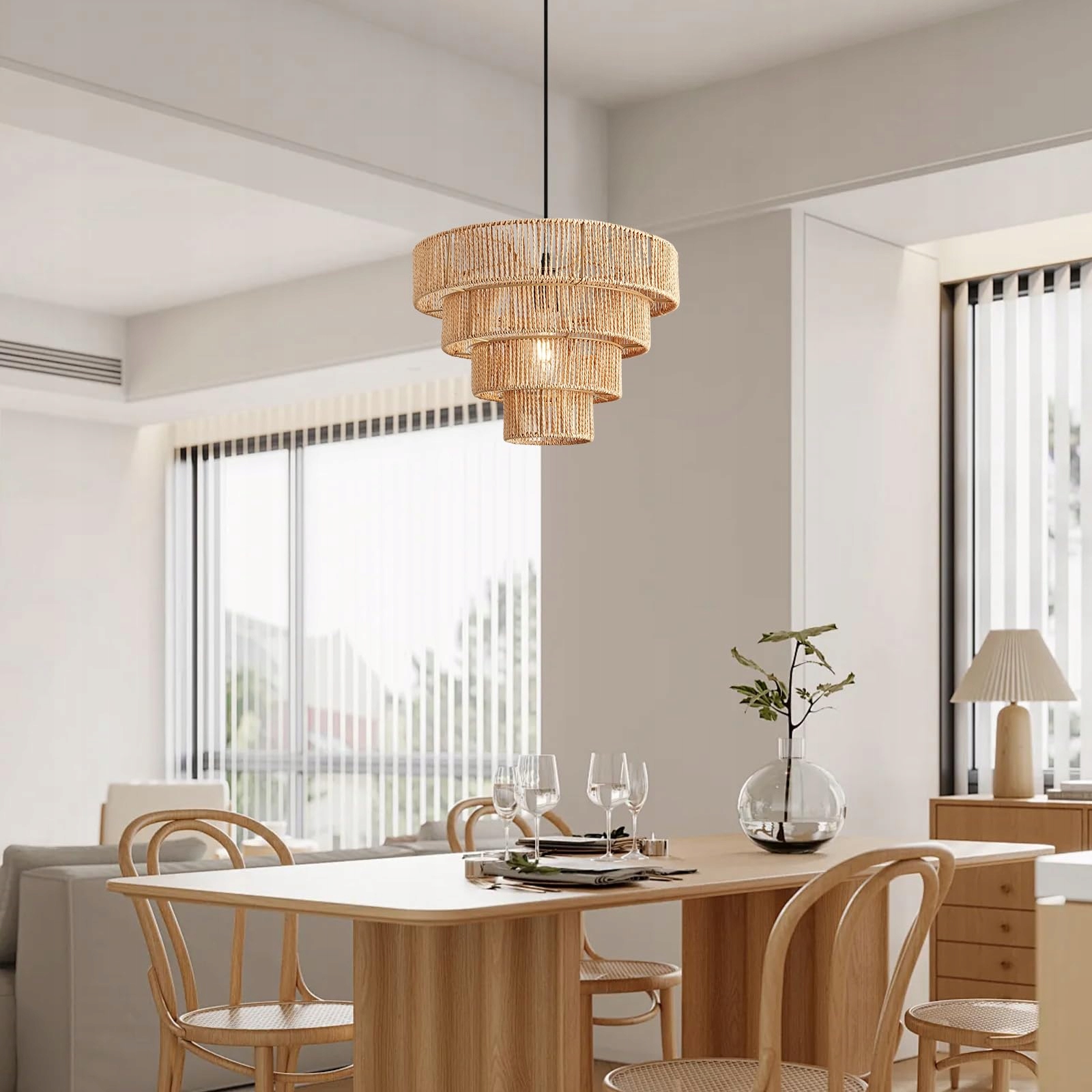 【Unikalny składany design】Lampa wisząca Rattan wyróżnia się nowym, czterostopniowym designem, w którym klosz stopniowo zmniejsza się od góry do dołu. Dzięki temu klosz można łatwo złożyć do przechowywania i lepiej kierować światło w dół. Struktura siatki dodatkowo emituje światło z wnętrza na zewnątrz, nadając pomieszczeniu ciepły, glamour blask.