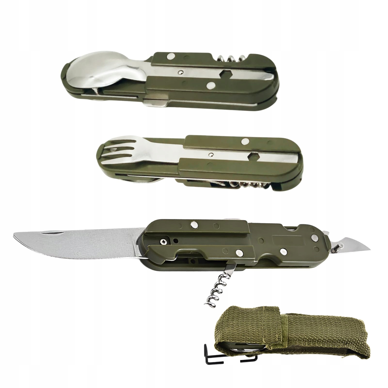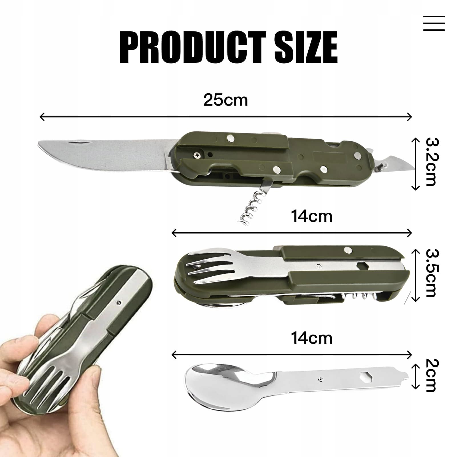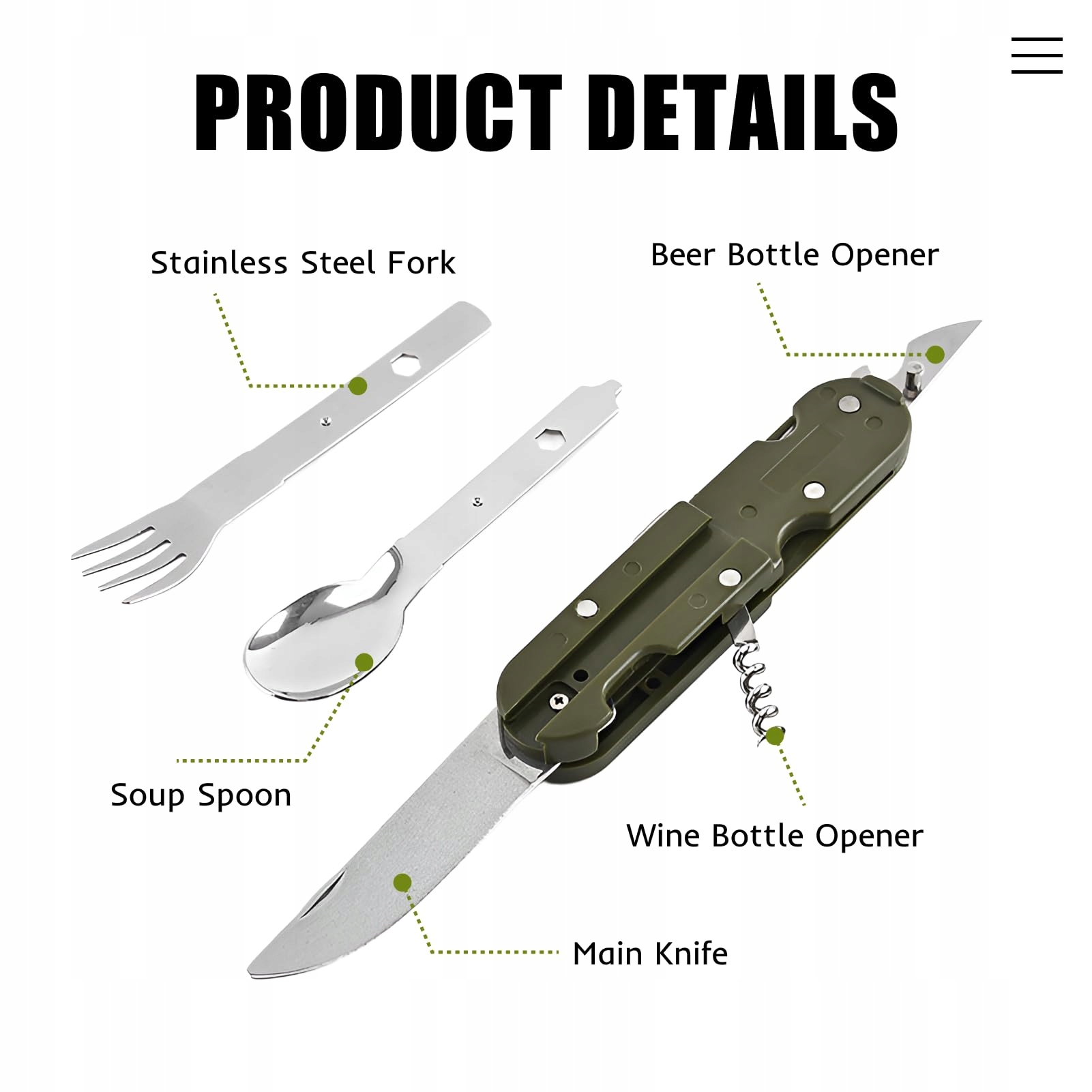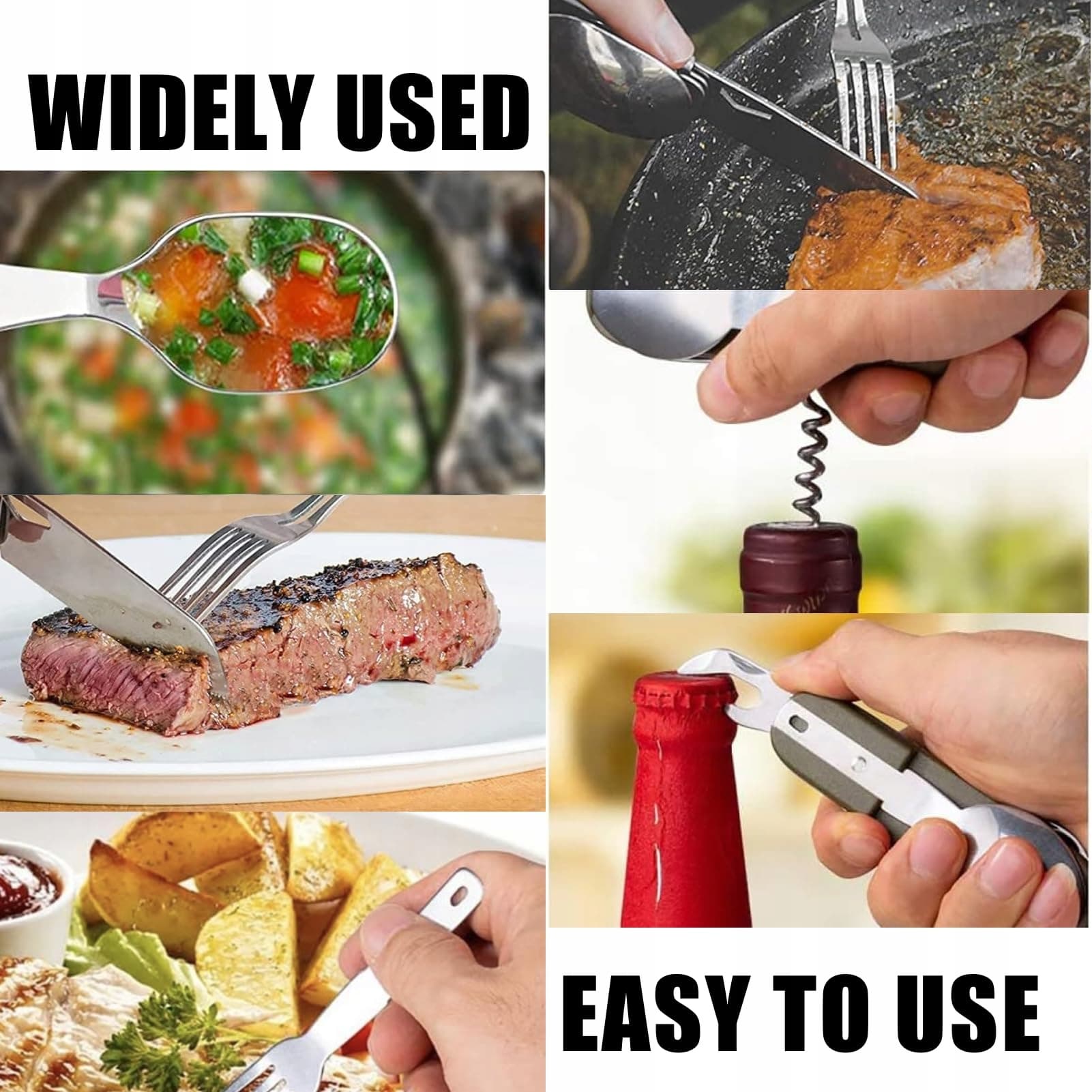 🛠️ Uniwersalny Zestaw 5 w 1 (Nóż + Widelec + Łyżka + Otwieracz do Puszek + Otwieracz do Butelek) Wyposaż się na każdą sytuację: przygotuj posiłki, otwieraj konserwy i butelki lub radź sobie w nagłych wypadkach na świeżym powietrzu. Narzędzia odłączalne i wymienne w jednym ruchu.