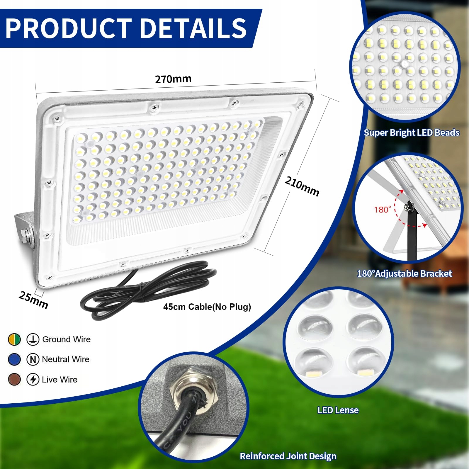 🌟【Super jasny i dobra dystrybucja ciepła】100 W reflektor halowy wewnętrzny z 144 ultra jasnymi diodami LED, może generować do 10000 LM bardzo jasnego białego światła. Zewnętrzne oświetlenie bezpieczeństwa ma kąt świecenia 120° i zapewnia źródło światła oraz obszar naświetlania o wysokiej jasności. Reflektor jest wyposażony w radiator z żeberkami chłodzącymi, dzięki czemu nasz reflektor LED ma dobrą zdolność odprowadzania ciepła.