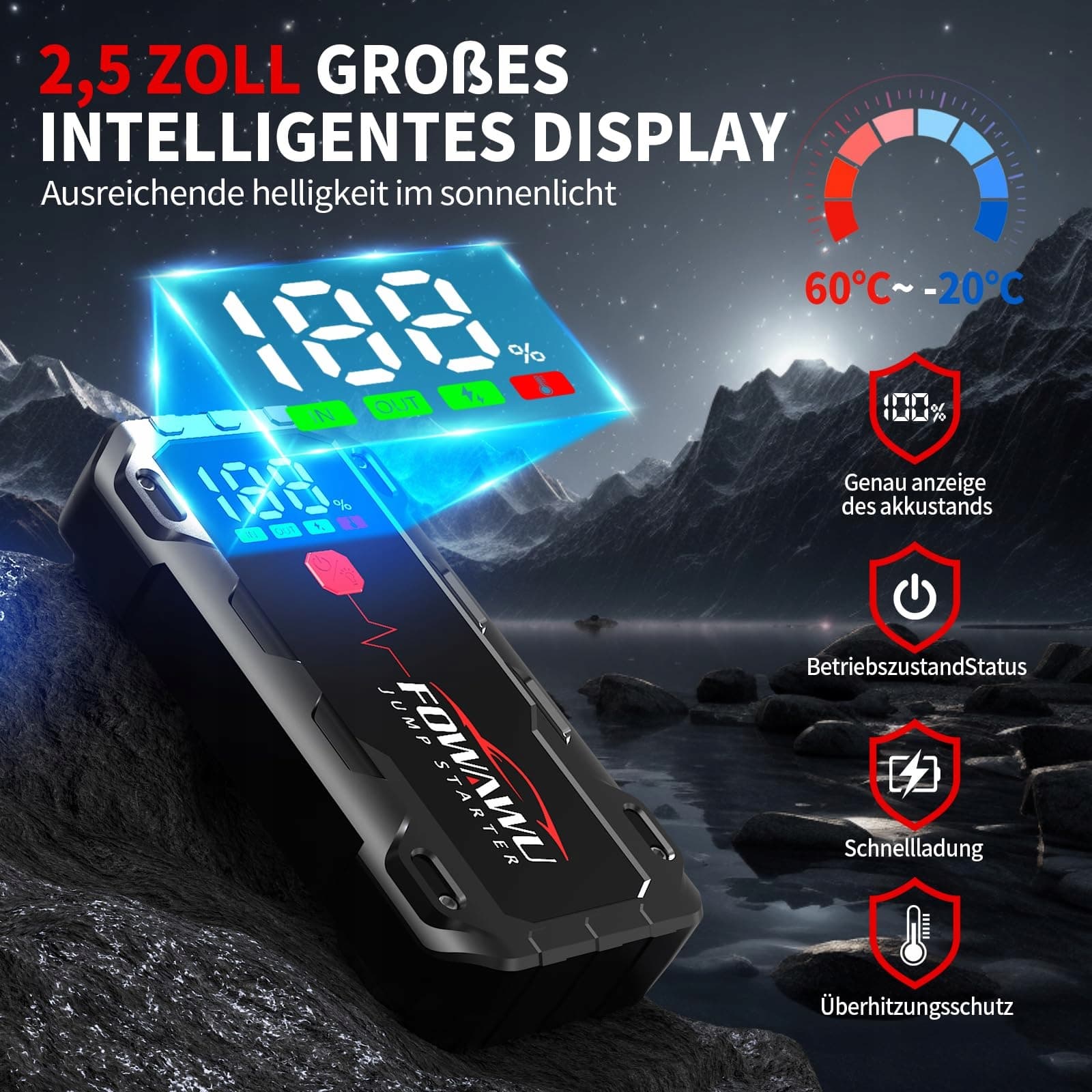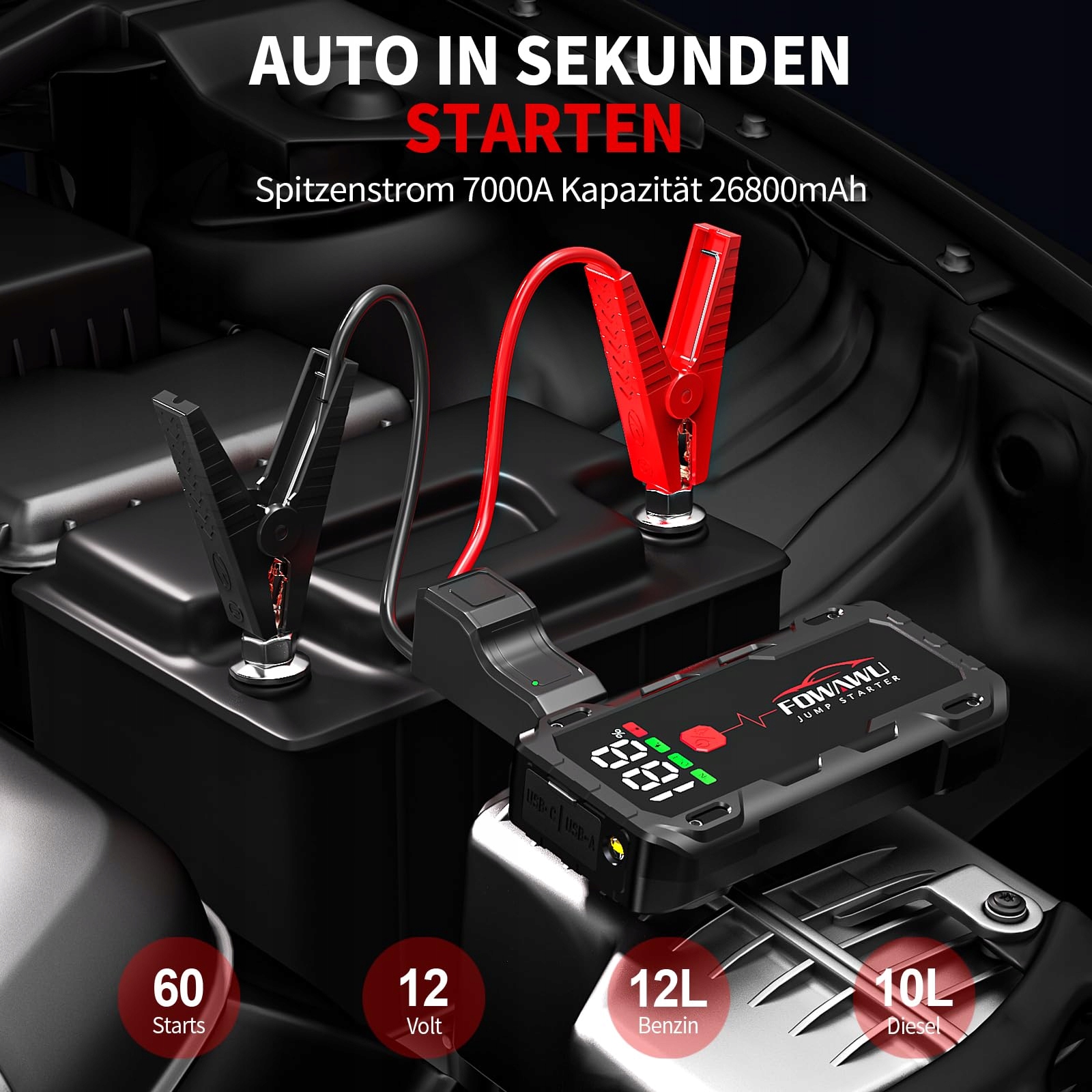FOWAWU 7000A 26800mAh Rozrusznik Powerbank (Do 12L Benzyny / 10L Diesla) Rozrusznik samochodowy z latarką LED, dużym wyświetlaczem, zaciskami rozruchowymi, wzmacniaczem akumulatora samochodowego dla SUV, motocykli, kosiarek