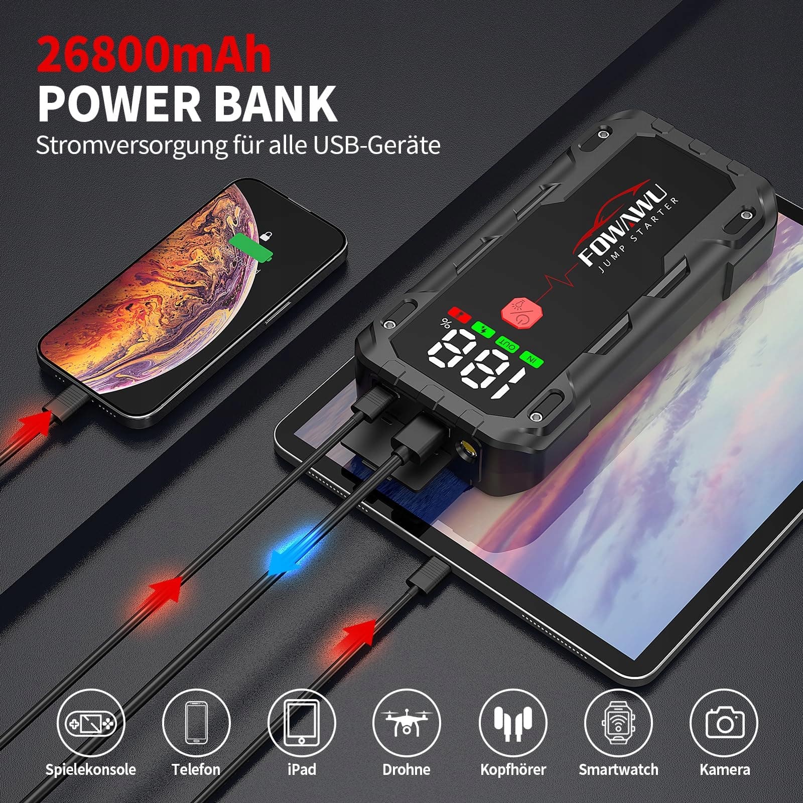 FOWAWU Powerbank 7000A 26800mAh Rozruchowa Do Auta SUV Motocykla LED