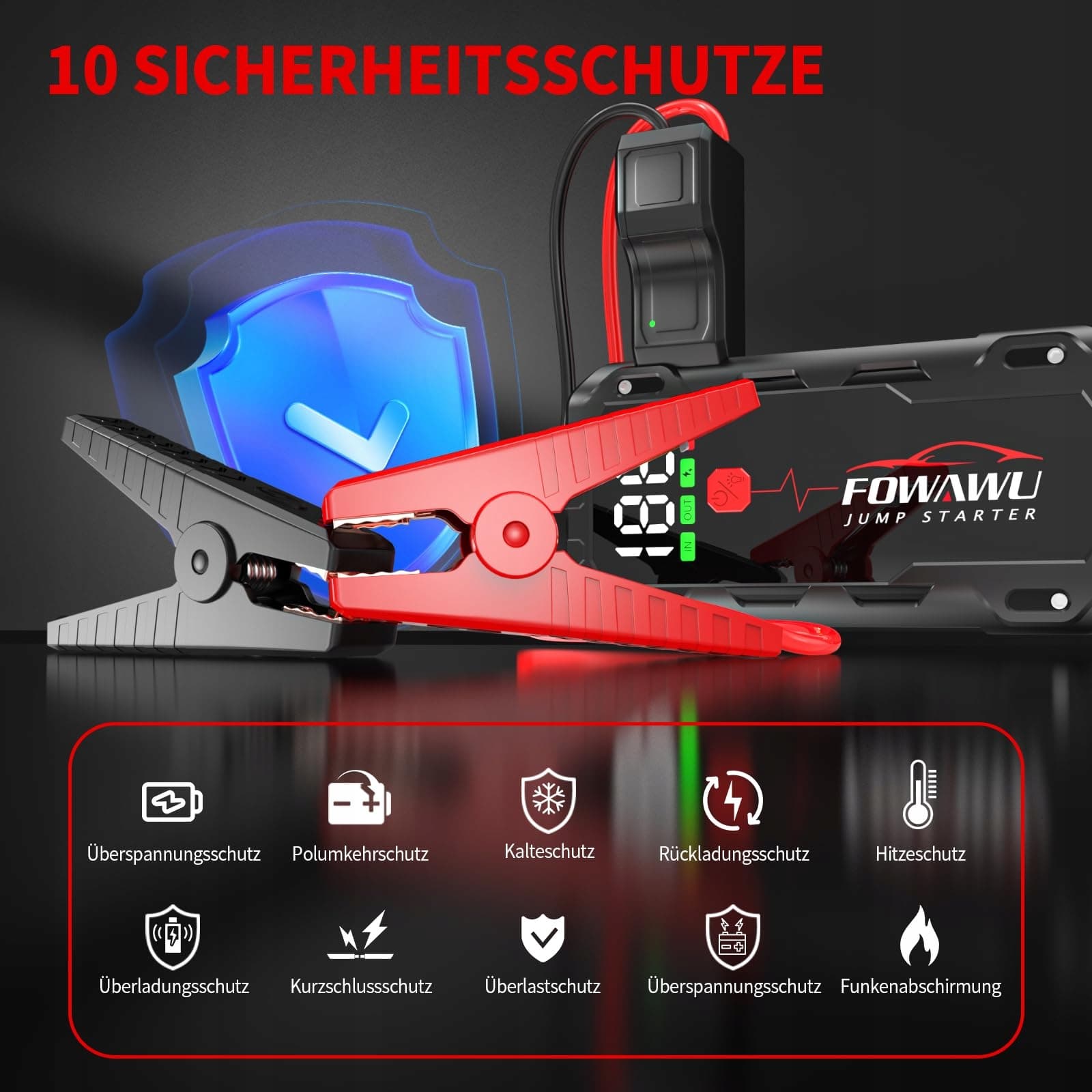 【5-w-1 Wielofunkcyjność】 Urządzenie służy jako rozrusznik akumulatorów samochodowych, przenośna powerbank o pojemności 26800 mAh (dla dronów, słuchawek itp.) oraz latarka LED z 3 trybami (latarka, światło błyskowe, SOS). Rozrusznik powerbank FOWAWU jest odporny na wstrząsy z wysokości 1,2 metra. Bezpieczeństwo i doświadczenie użytkownika są dla nas ważne – niezawodny towarzysz podróży na każdą przygodę