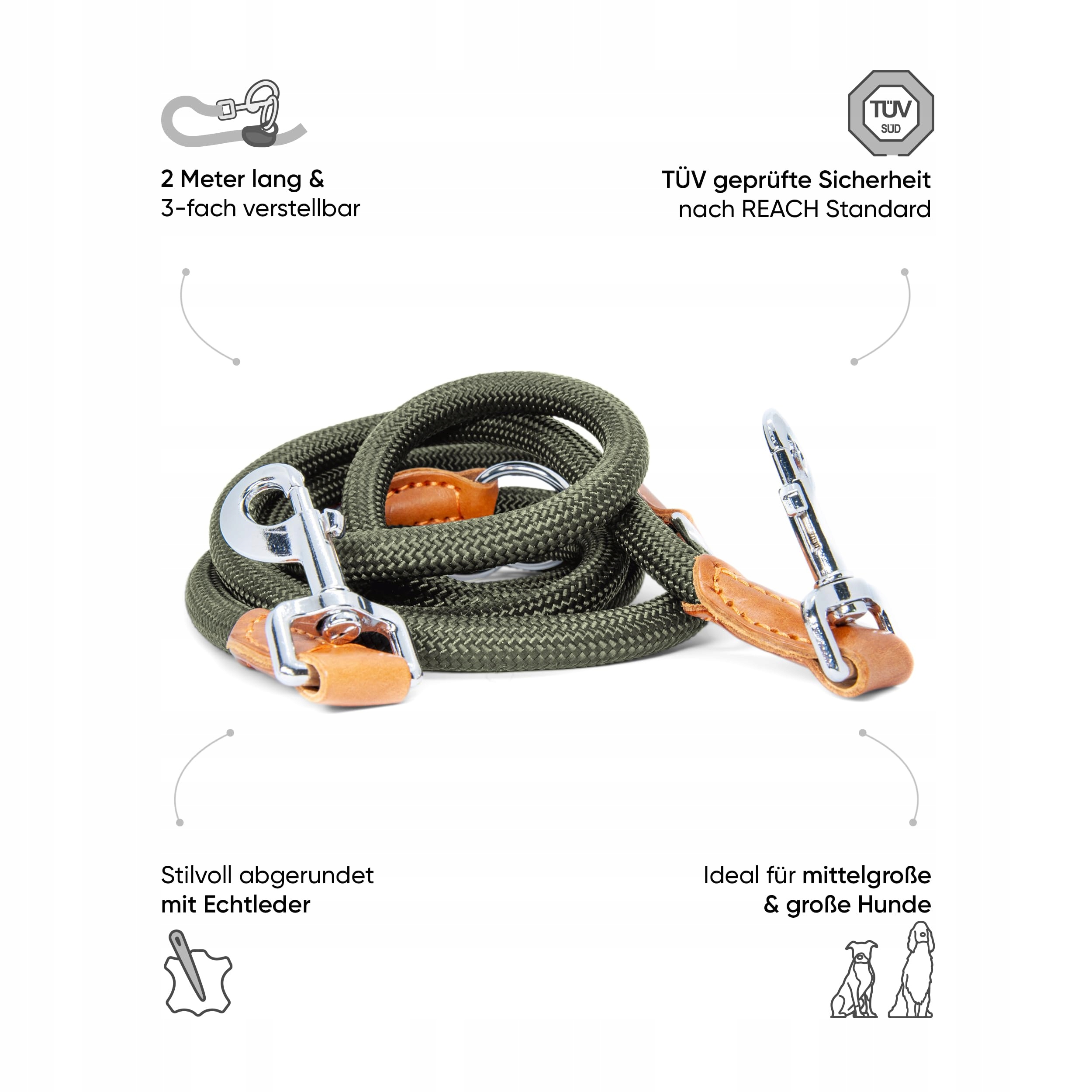 FREUDENTIER® Smycz dla psa 2m dla średnich i dużych psów – 3-krotnie regulowana - Wytrzymały nylon z eleganckimi brązowymi elementami skórzanymi (Zielony las)