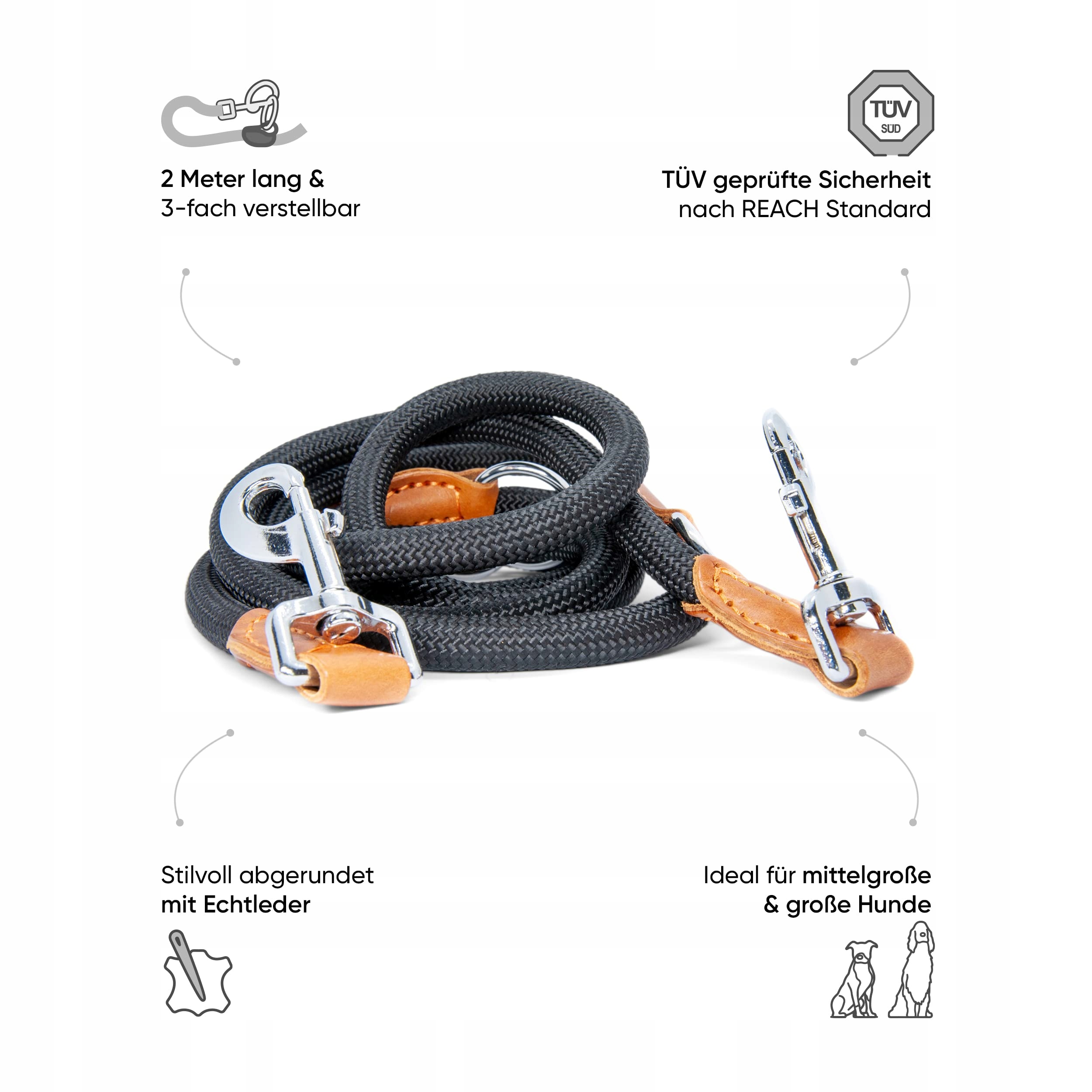 FREUDENTIER® Smycz dla psa 2m dla średnich i dużych psów – 3-krotnie regulowana - Smycz prowadząca z wytrzymałego nylonu, wykończona stylowymi brązowymi elementami skórzanymi (czarna)