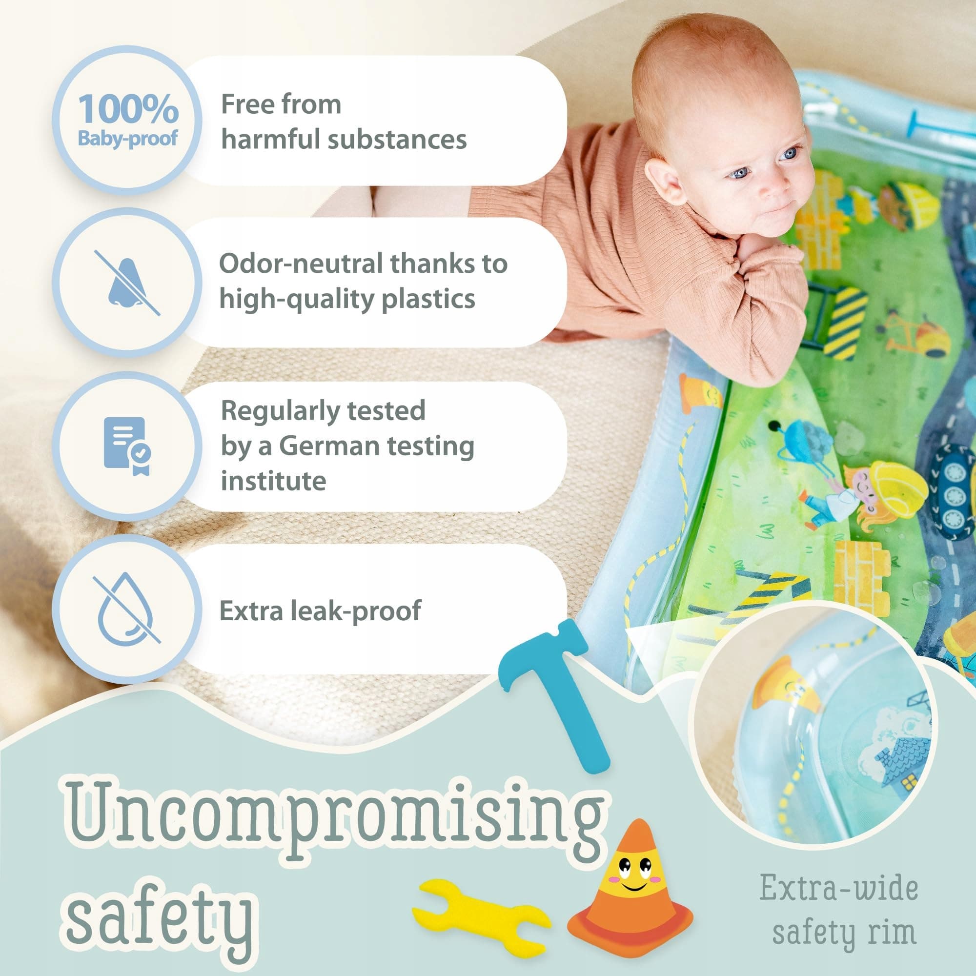🍃【Przetestowana i bezpieczna】Używamy wyłącznie wysokiej jakości materiałów, które są wolne od BPA, ołowiu i ftalanów. Wytrzymały materiał zapewnia, że mata wodna wytrzyma nawet bardziej aktywne dzieci. Każda mata do raczkowania jest również oddzielnie testowana pod kątem szczelności i jakości.