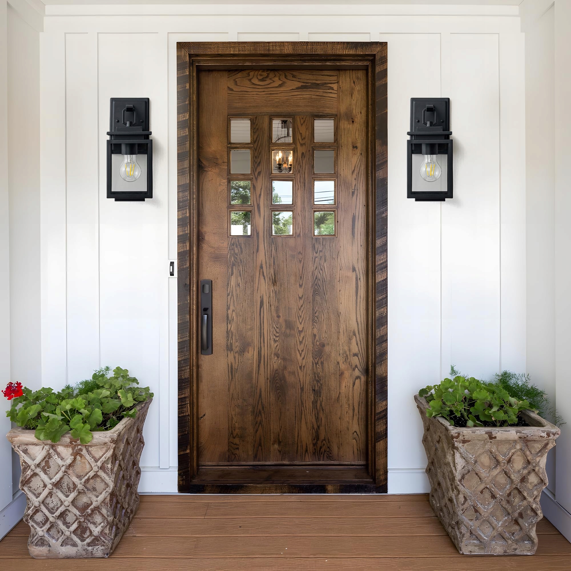 Odporne na warunki atmosferyczne kinkiety: Ten kinkiet zewnętrzny E27 z solidną metalową ramą i wzmocnionym szkłem jest wodoodporny (IP44) i trwały. Odporny na słońce, śnieg, deszcz i lód. Wysokiej jakości metal jest odporny na rdzę i przez lata zachowuje elegancki wygląd.