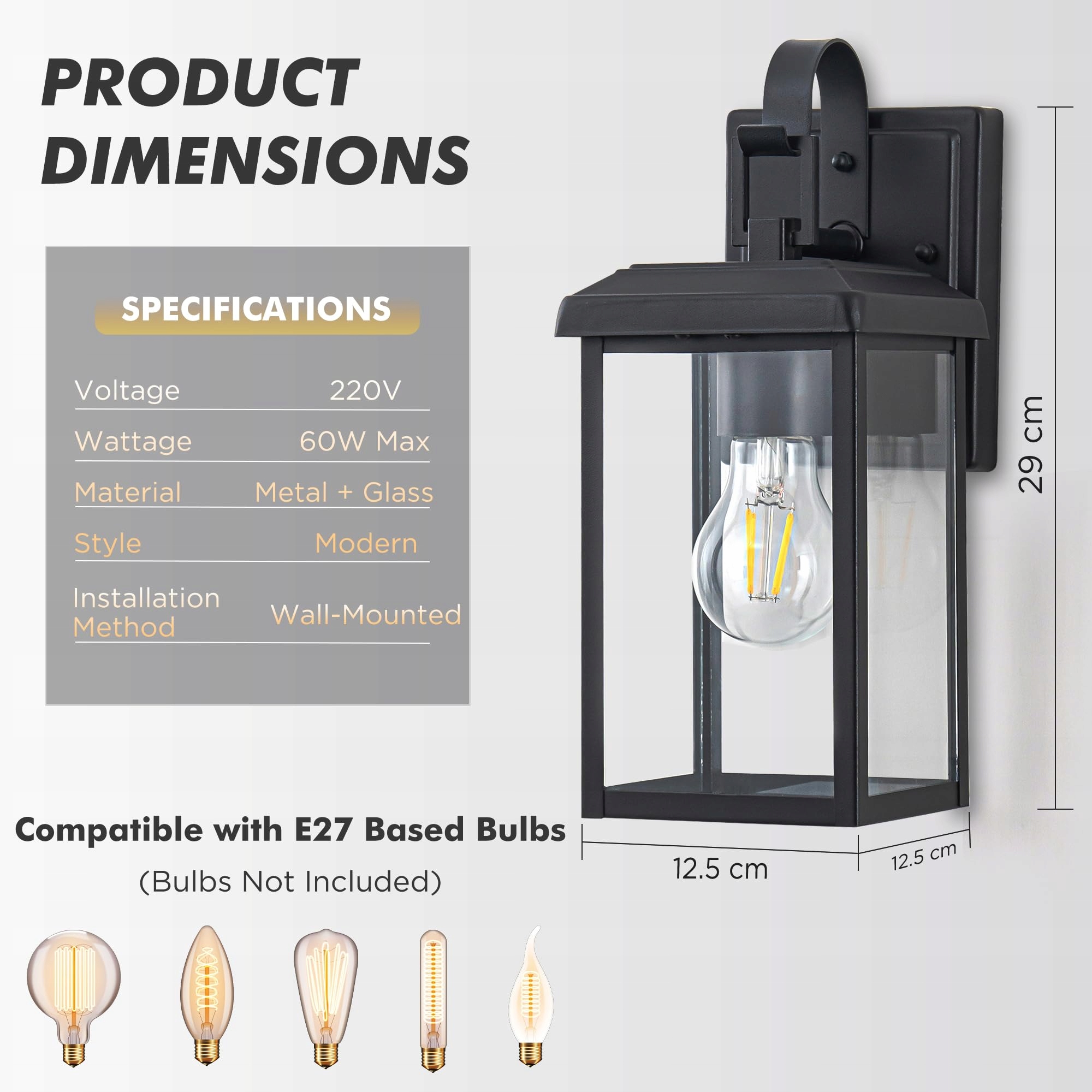 Wymagane żarówki z oprawką E27: Te wszechstronne lampy zewnętrzne są kompatybilne ze standardowymi żarówkami z oprawką E27 (brak w zestawie). Wybierz spośród LED, świetlówek kompaktowych, żarówek tradycyjnych lub halogenowych, aby stworzyć idealną atmosferę. (Maks. 60 W)