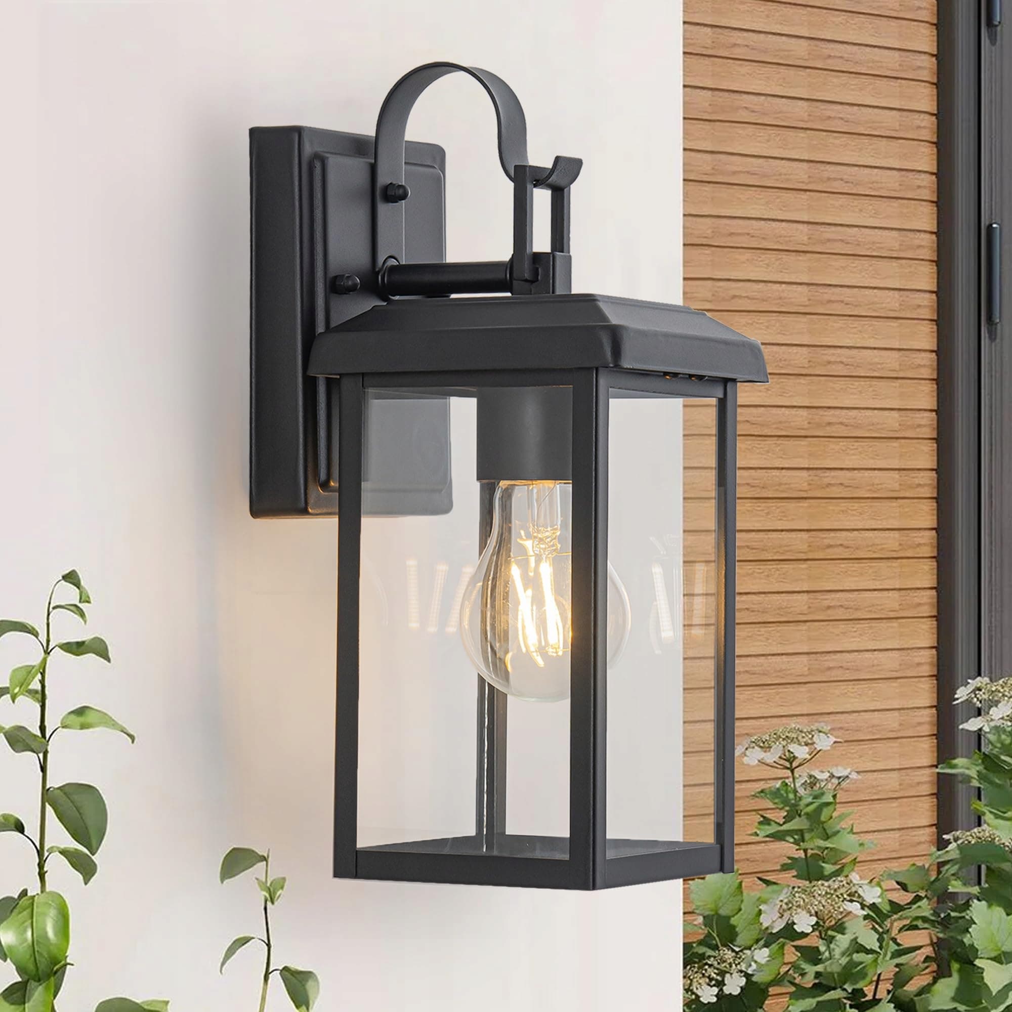 FTL Lampa ścienna zewnętrzna vintage, mała lampa ścienna zewnętrzna z oprawką E27, matowo czarna lampa ścienna zewnętrzna z przezroczystym szkłem, oświetlenie ogrodowe na ścianę domu, wodoodporna latarnia zewnętrzna IP44 na taras, werandę