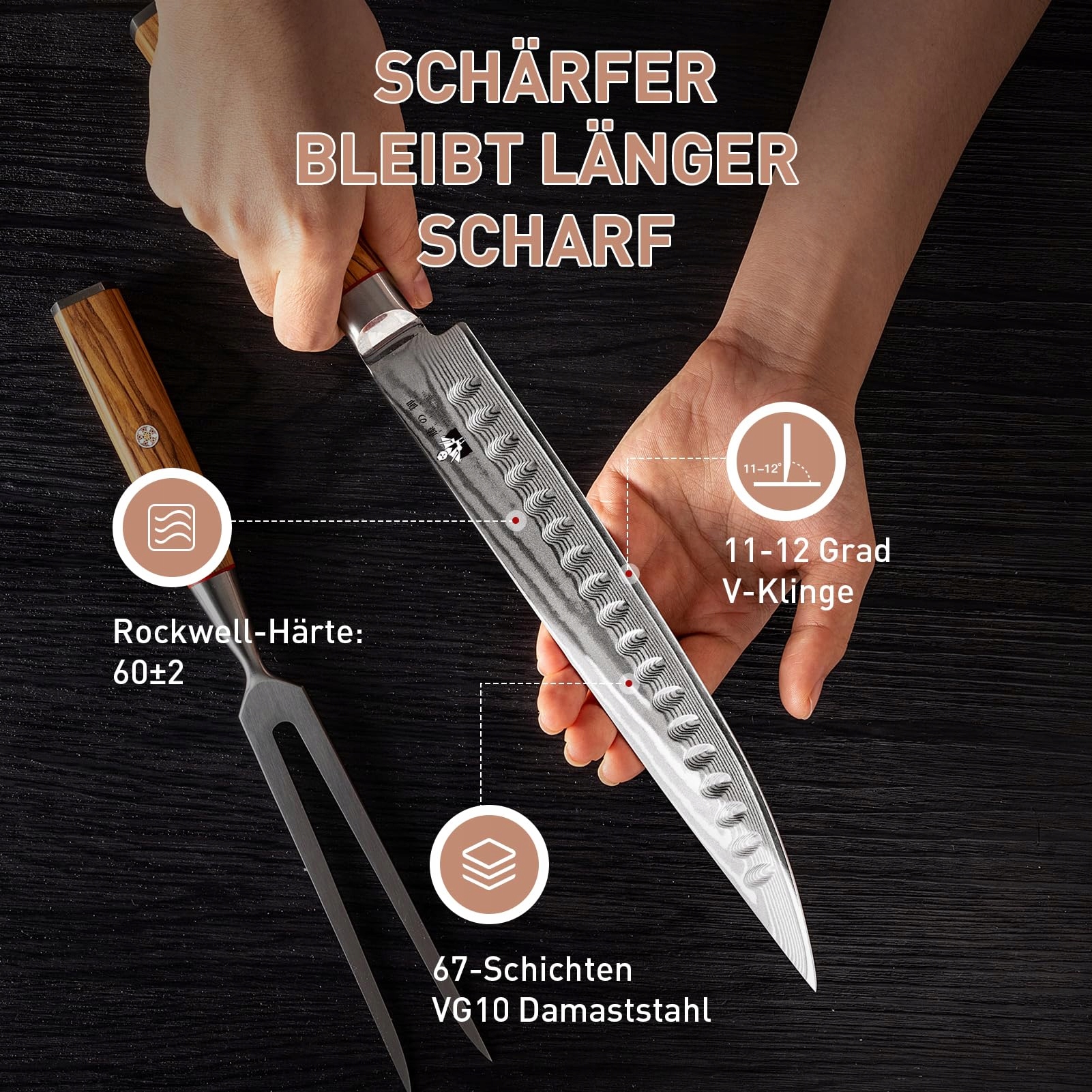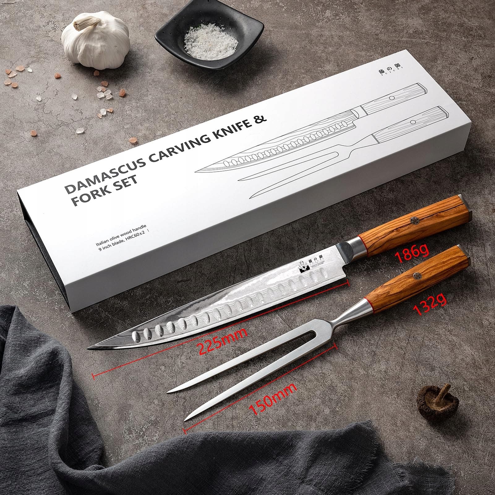 FUJUNI Zestaw noży do krojenia z widelcem, 2-częściowy, nóż do mięsa z ekstremalnie ostrym ostrzem 22,5 cm z 67 warstw stali damasceńskiej VG-10, widelec 28,7 cm, uchwyt z drewna oliwnego, pudełko prezentowe