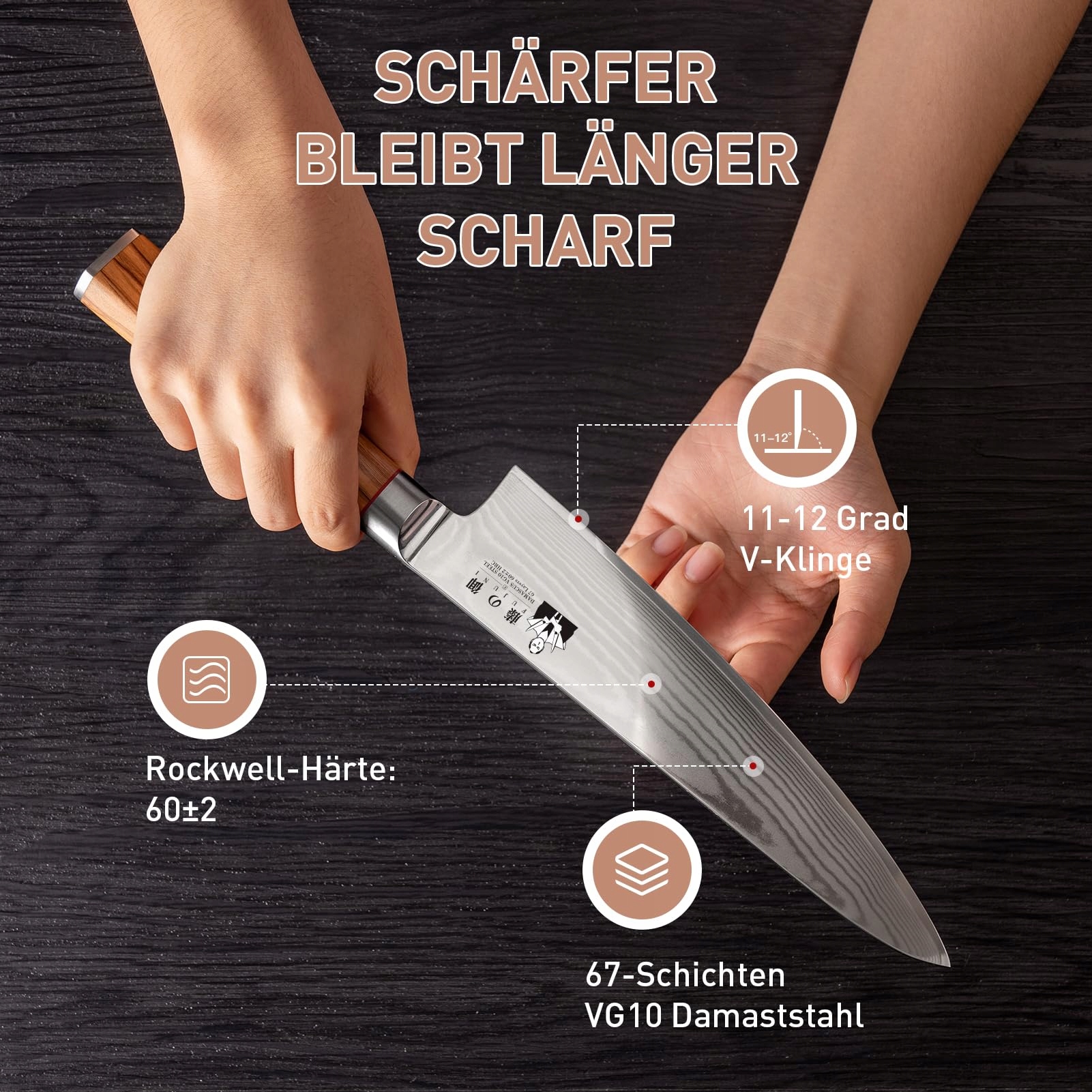 noże kuchenne VG10 stal damasceńska: Ten nóż kuchenny wykonany z 67-warstwowej stali damasceńskiej VG-10 charakteryzuje się wysoką odpornością na korozję, odpornością na zużycie i trwałością. Każde ostrze poddawane jest ultraprecyzyjnej obróbce cieplnej w próżni, twardość Rockwella wynosi 60±2 HRC. Zestaw zawiera nóż kuchenny, nóż santoku i nóż uniwersalny