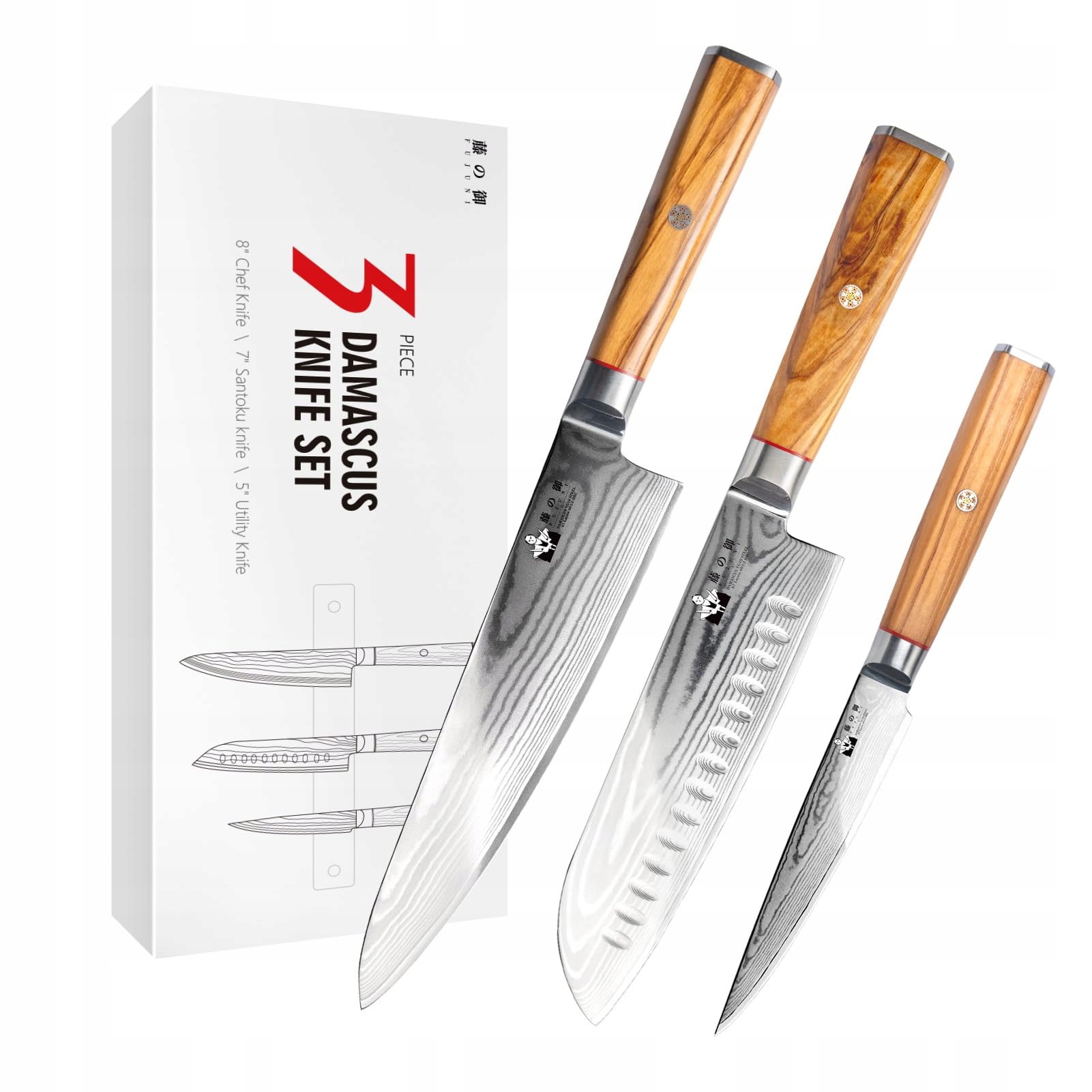 FUJUNI Zestaw Noży Damast 3-Częściowy Z Ostrzem VG-10 Rękojeść Z Olchy