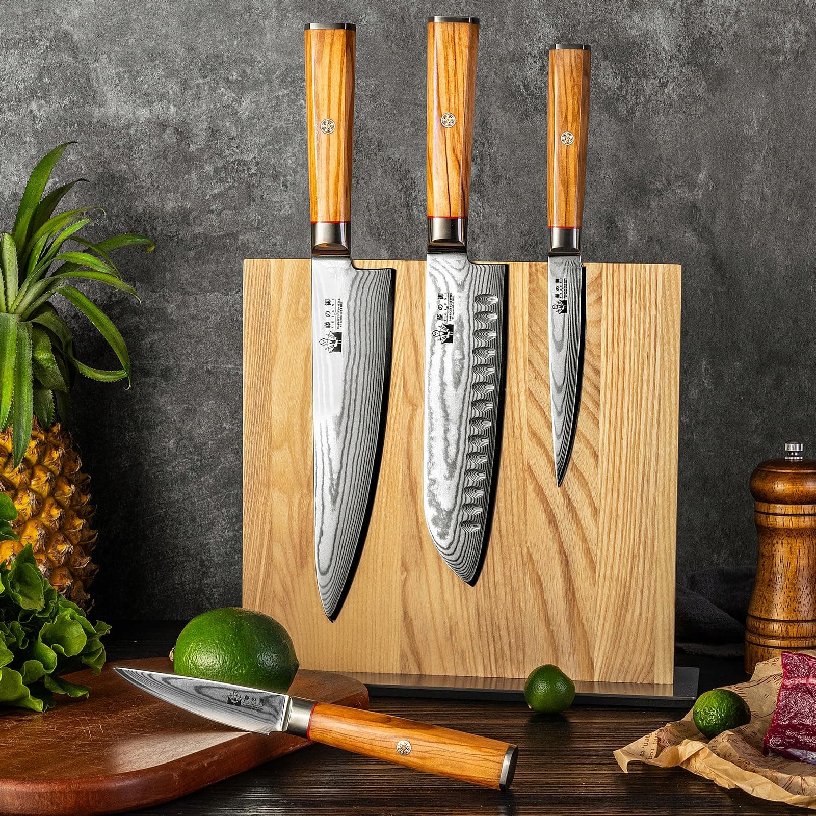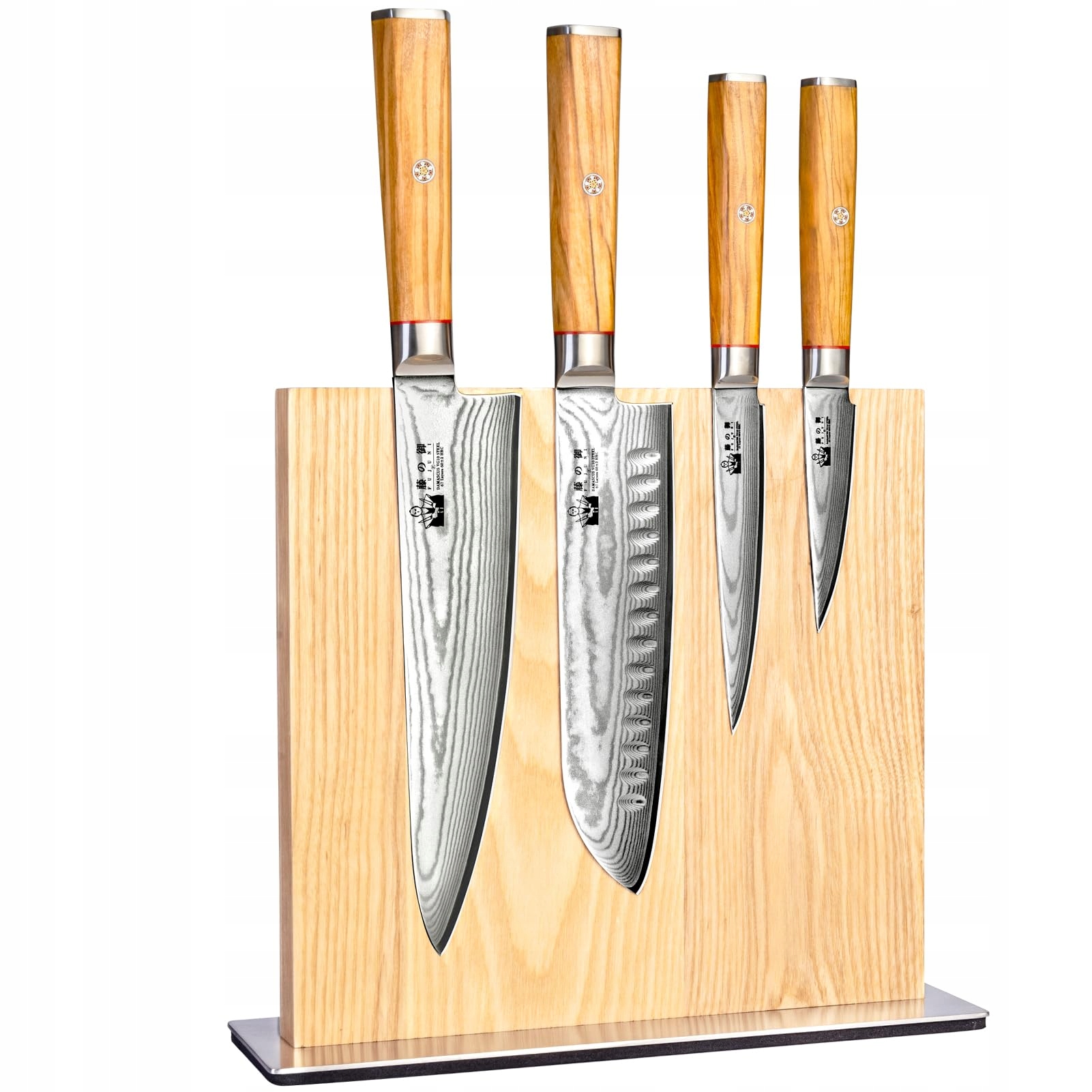 Zestaw noży damasceńskich z blokiem: Ten nóż kuchenny z 67-warstwowej stali damasceńskiej VG-10 charakteryzuje się wysoką odpornością na korozję, odpornością na zużycie i trwałością. Każde ostrze poddawane jest ultraprecyzyjnej obróbce cieplnej w próżni, twardość Rockwella wynosi 60±2 HRC. Zestaw zawiera nóż kuchenny, nóż Santoku, nóż uniwersalny, nóż do warzyw oraz blok na noże