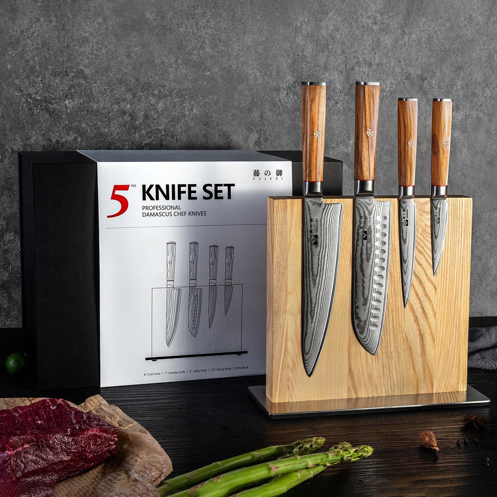 Zestaw noży FUJUNI z blokiem, 5-częściowy zestaw noży damasceńskich z ekstremalnie ostrym ostrzem z 67 warstw VG-10 stali damasceńskiej, uchwyt z drewna oliwnego, pudełko prezentowe