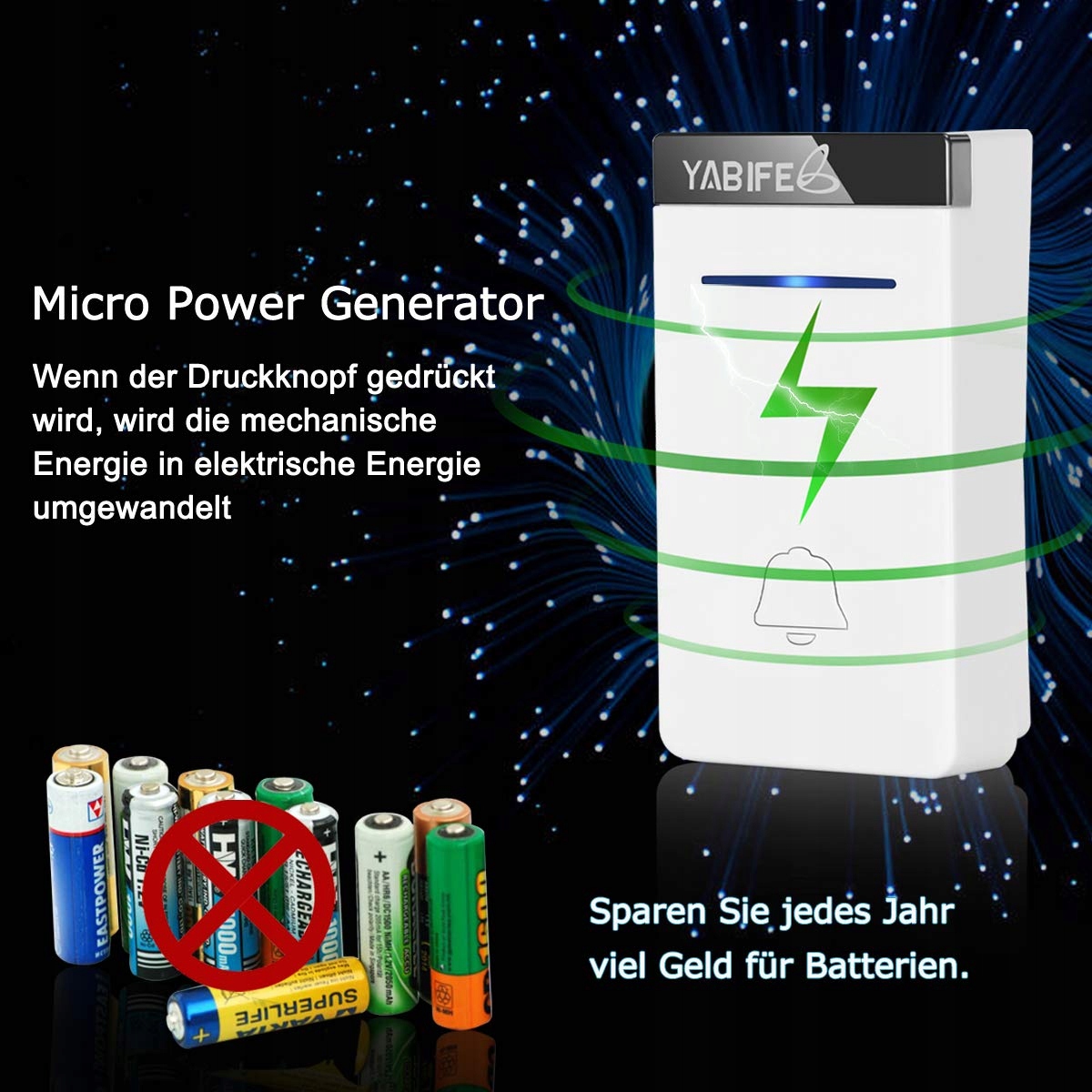 W ogóle nie wymaga baterii: Nie musisz już męczyć się z wymianą baterii, a nadajnik nie będzie już "martwy" jak te zasilane bateriami. Dlatego instalacja jest znacznie prostsza, odbiornik do gniazdka, nadajnik na ścianę, dzwonek zaczyna działać w mniej niż dwie minuty