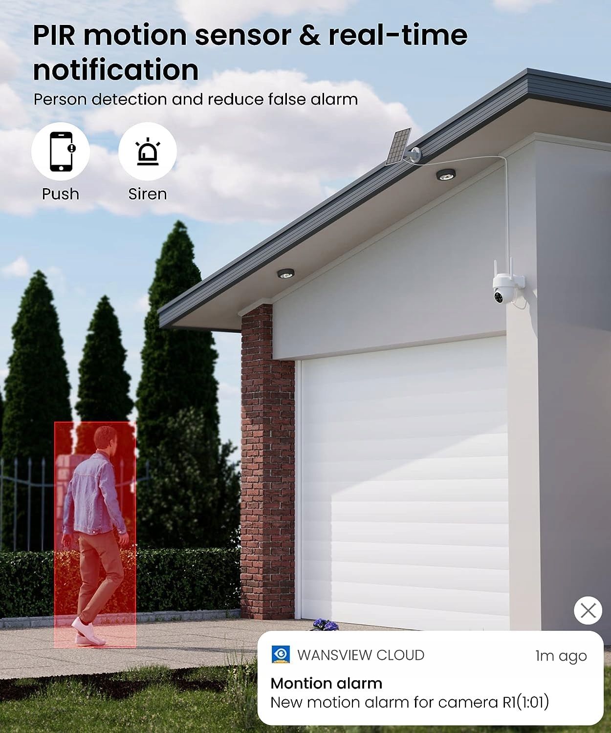 [Czujnik ruchu PIR z detekcją ruchu] W przeciwieństwie do innych zwykłych kamer, ta bezprzewodowa kamera monitorująca zewnętrzna posiada wbudowany czujnik ruchu PIR, który może identyfikować ludzkie ciało na podstawie temperatury, co znacznie redukuje fałszywe alarmy. 10-sekundowe wideo z ruchu jest rejestrowane w aplikacji, a Ty otrzymasz powiadomienie w czasie rzeczywistym na swoim telefonie, gdy wykryty zostanie ruch.