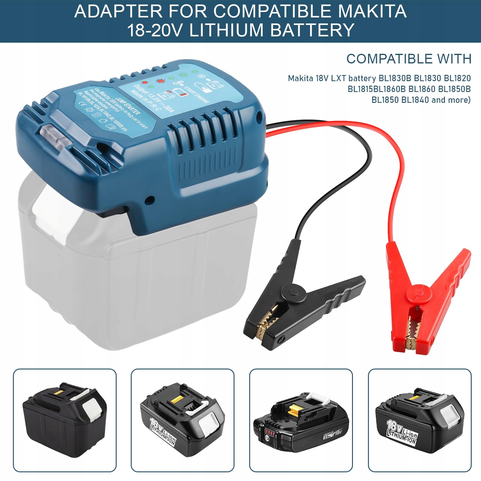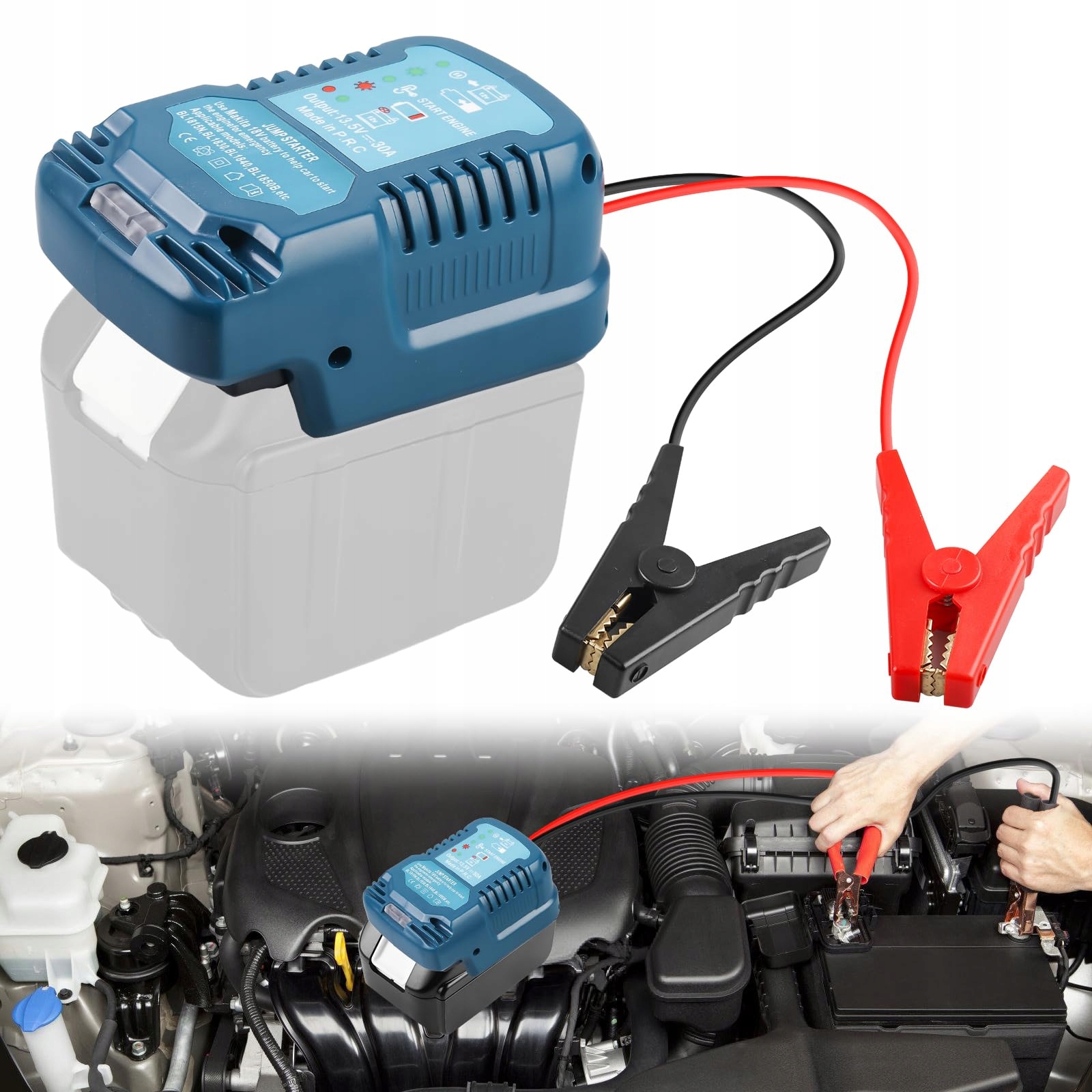 Do miniładowarki 18V: Ten adapter rozruchowy powerbank do akumulatorów litowych 18V, takich jak BL1830, BL1830B, BL1840, BL1840B, BL1850, BL1860B (akumulator NIE jest w zestawie) Camping, outdoor, samochód. Połączony z baterią 18V/20V, zielone światło, połączony z akumulatorem samochodowym dodatnim i ujemnym (ograniczone do akumulatora samochodowego 12V). Adapter rozruchowy powerbank do akumulatorów 18V.