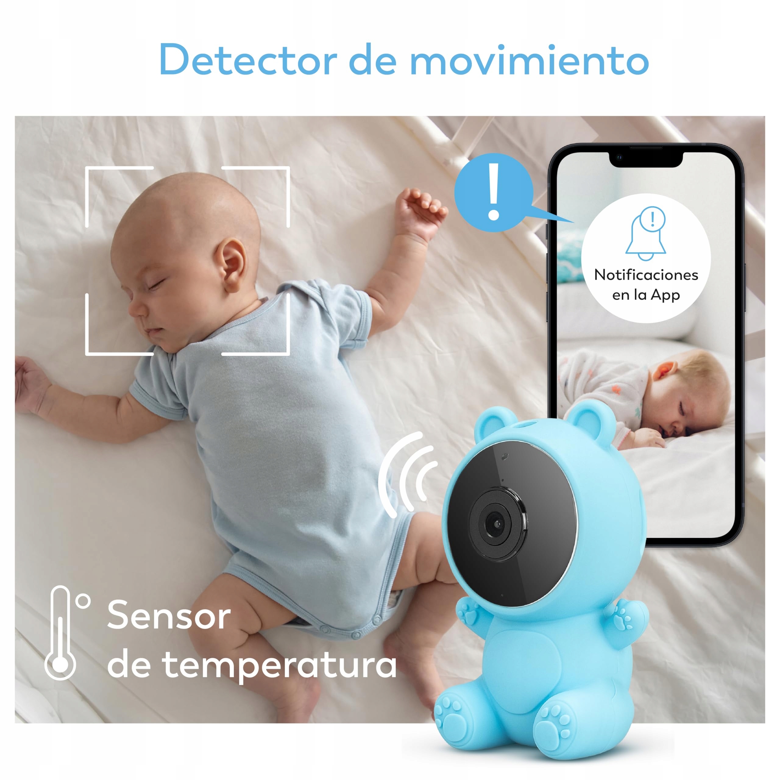 Czujnik temperatury oraz detektor ruchu i płaczu: Otrzymuj powiadomienia na swoim telefonie, gdy temperatura w pomieszczeniu spadnie poniżej ustawionego zakresu, a także gdy wykryte zostaną płacz, dźwięki lub ruchy dziecka.