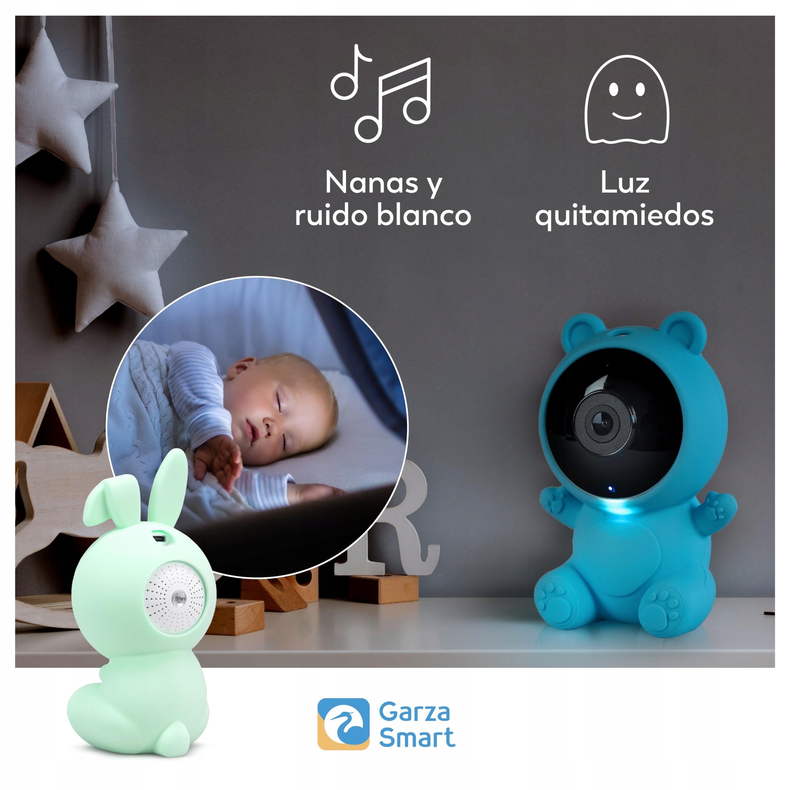 Garza - 1080p HD Kamera do monitorowania dzieci z czujnikiem temperatury, nocnym widzeniem, wykrywaniem płaczu, kołysankami, białym szumem i WiFi 2,4 GHz (3 obudowy + podstawka)