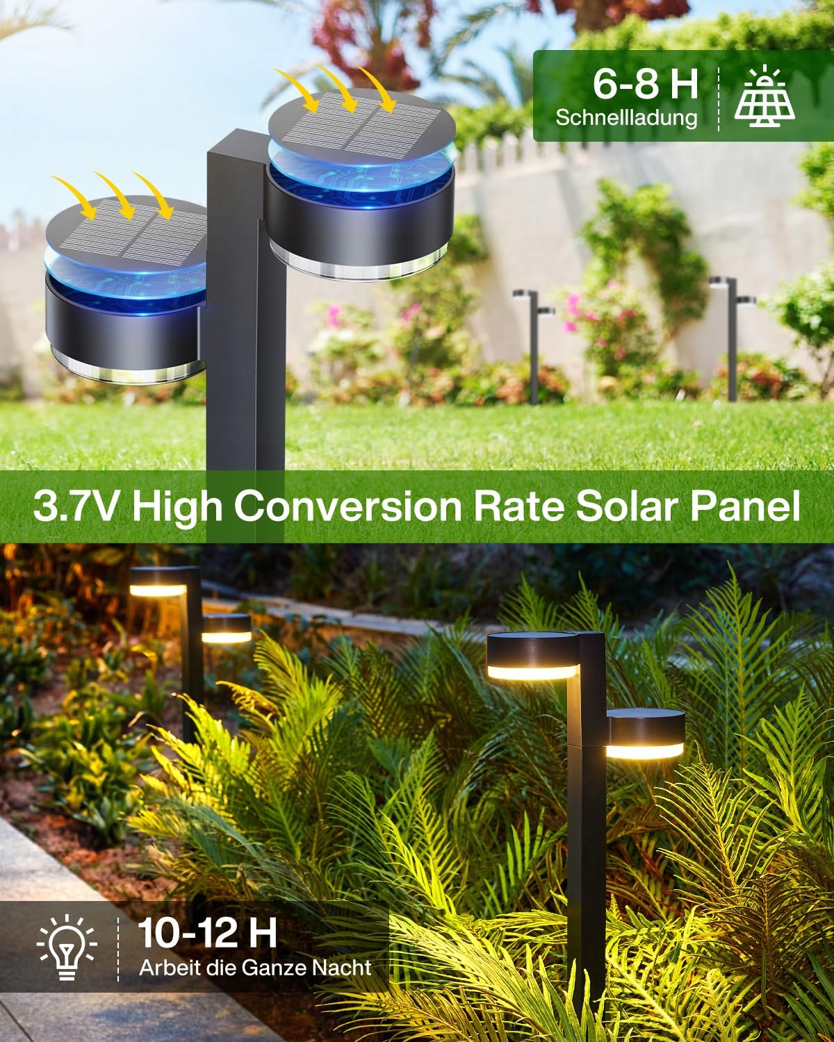 Podwójnie Ulepszone Panel Solarny i Automatyczne Włączanie/Wyłączanie: Lampy solarne na zewnątrz wyposażone są w 2 monokrystaliczne panele słoneczne o wysokiej konwersji, dzięki czemu nasze lampy solarne na zewnątrz ładują się do 50% szybciej niż inne lampy solarne i przekształcają 2-krotnie więcej energii słonecznej (do 25% wskaźnika konwersji energii). Włącz przełącznik przed pierwszym użyciem, lampy solarne ogrodowe automatycznie włączają się o zmierzchu i wyłączają o świcie