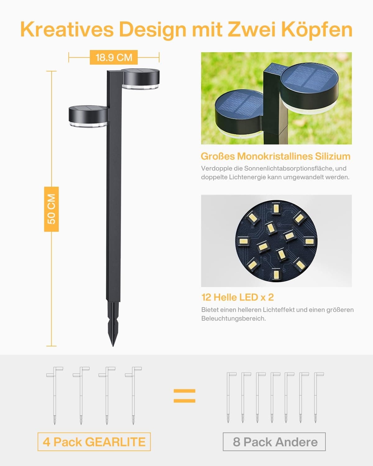 GEARLITE Lampy Solarne Zewnętrzne 4 Sztuki Super Jasne 24 LED 1200mAh | Premium Supply