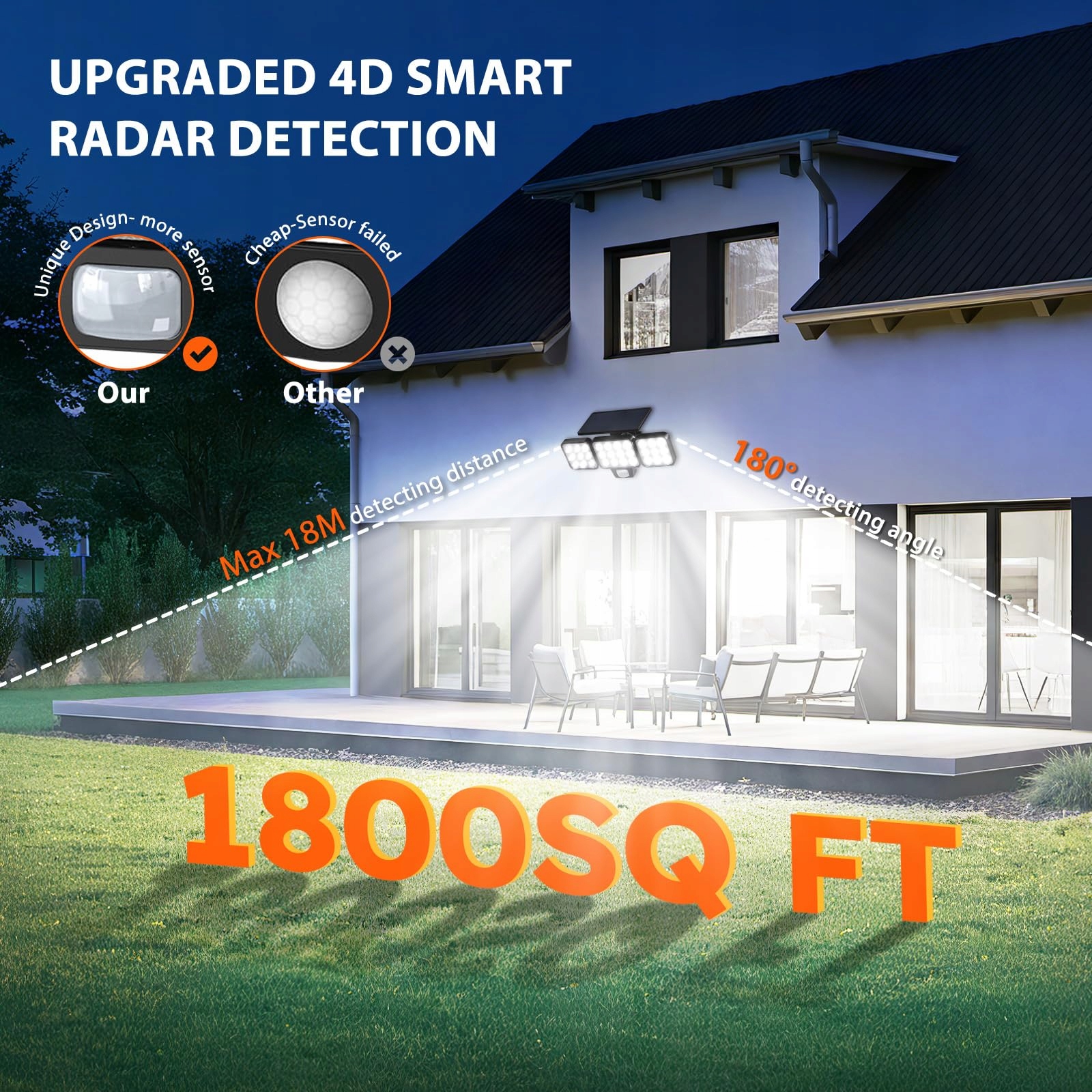 Ulepszony czujnik ruchu PIR: W porównaniu z czujnikami PIR innych marek, nasze lampy solarne na zewnątrz z czujnikiem ruchu mają unikalny, zakrzywiony design. Dzięki temu czujnik ruchu wykrywa aktywność ludzi lub zwierząt w zakresie 180° na odległość do 60 stóp (ok. 18 metrów) – to dwukrotnie większy zasięg wykrywania niż w porównywalnych produktach. Ta lampa solarna z czujnikiem ruchu na zewnątrz to idealny wybór do oświetlenia podwórek i przestrzeni zewnętrznych.