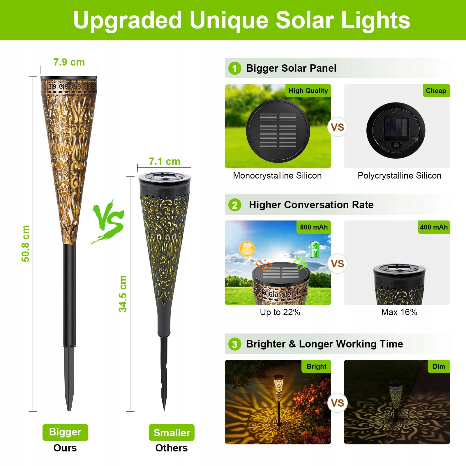 800mAh & 10-12h czasu pracy: Dzięki wysokiej wydajności konwersji, dekoracja ogrodu na zewnątrz jest wyposażona w baterię o pojemności 800mAh, co stanowi 33,33% więcej niż pojemność tradycyjnej lampy solarnej 600mAh. Lampy solarne na zewnątrz balkon mogą pracować nieprzerwanie przez 10-12 godzin po 6-8 godzinach bezpośredniego nasłonecznienia. Jaśniejsze diody LED mogą również bez trudu pracować przez całą noc.