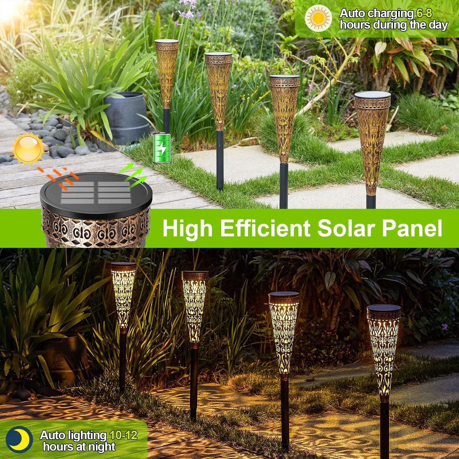 Dekoracja ogrodu: Lampy solarne do ogrodu na zewnątrz składają się z wysokiej jakości panelu solarnego i vintage klosza w stylu mosiądzu. Jasne światło świeci przez ażurową obudowę, tworząc piękny wzór na ziemi. Piękne wzory są idealną dekoracją dla ogrodowych ścieżek i tworzą ciepłą i uroczą atmosferę. (Dekoracyjne lampy solarne na zewnątrz nie zastępują oświetlenia ogrodowego)